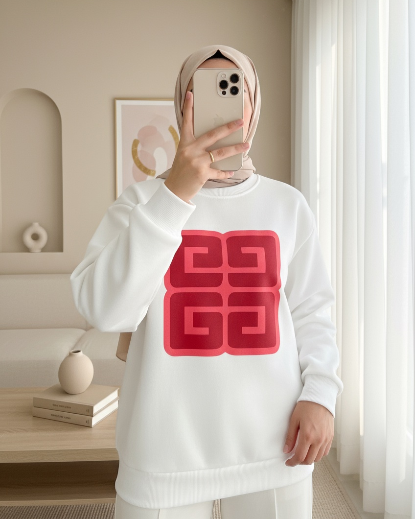 Harf Baskılı Bisiklet Yaka Şardonlu Sweat -Beyaz-Beyaz