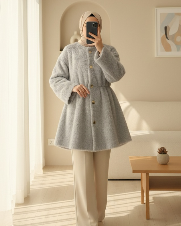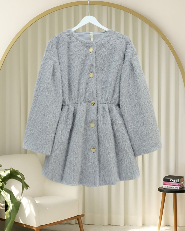İçi Astarlı Beli Büzgülü Kürklü Ceket -Açık Gri-Açık Gri