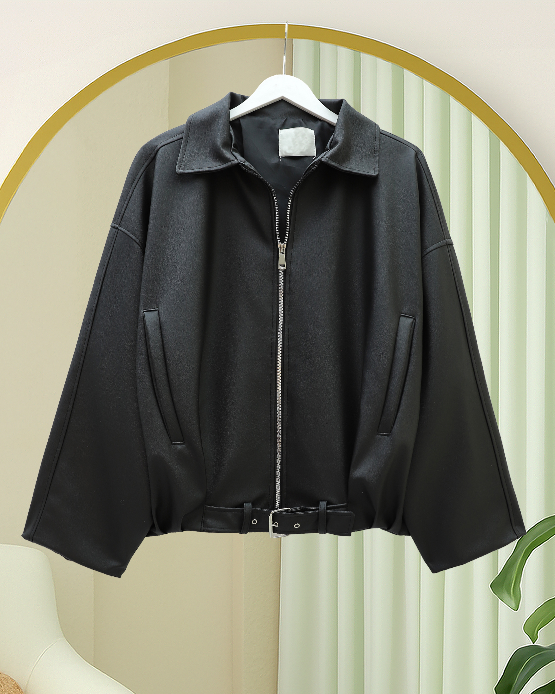 İçi Astarlı Beli Kat Detaylı Kemerli Deri Ceket -Siyah-siyah