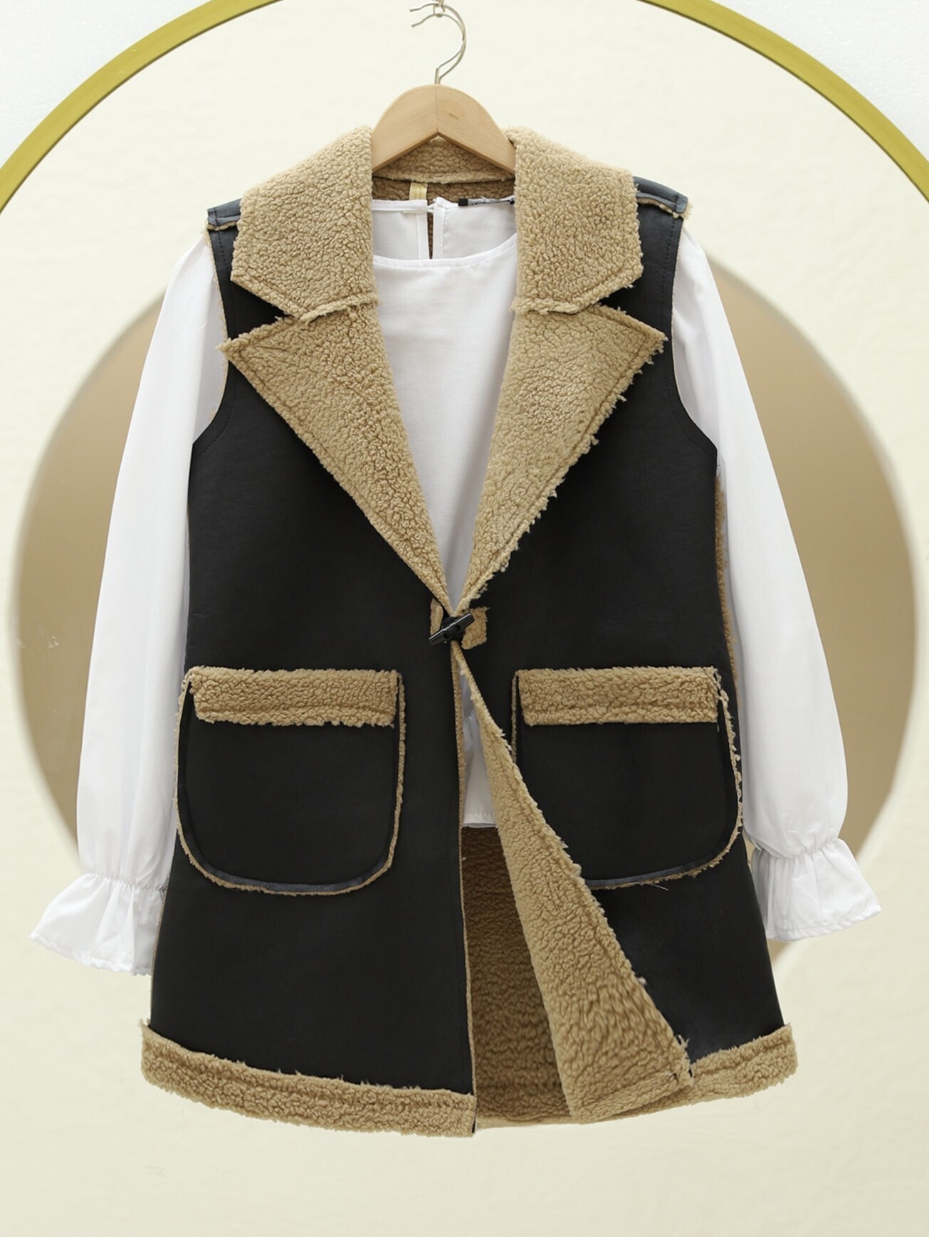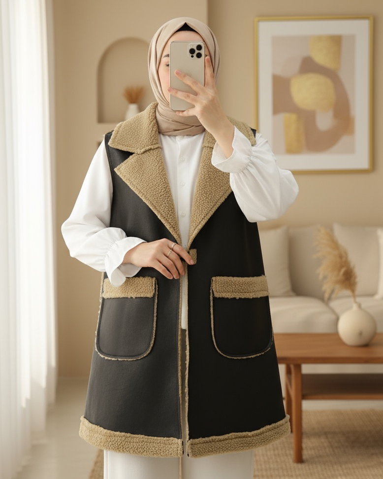 İçi Kuzu Peluş Çift Cepli Yelek -Vizon-Vizon