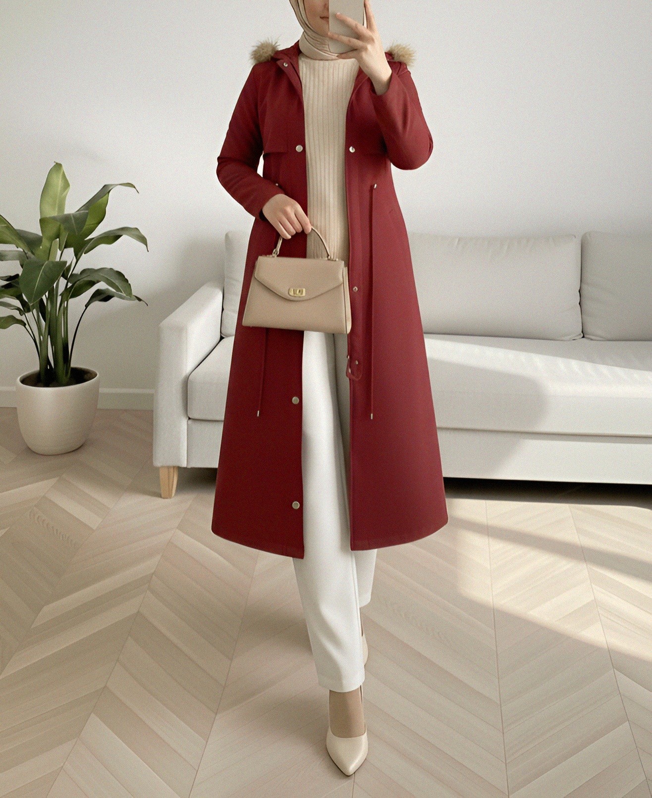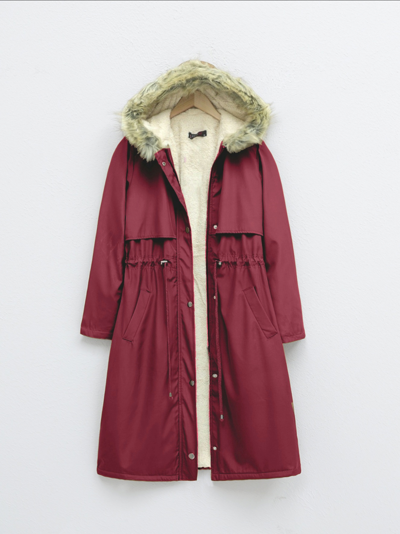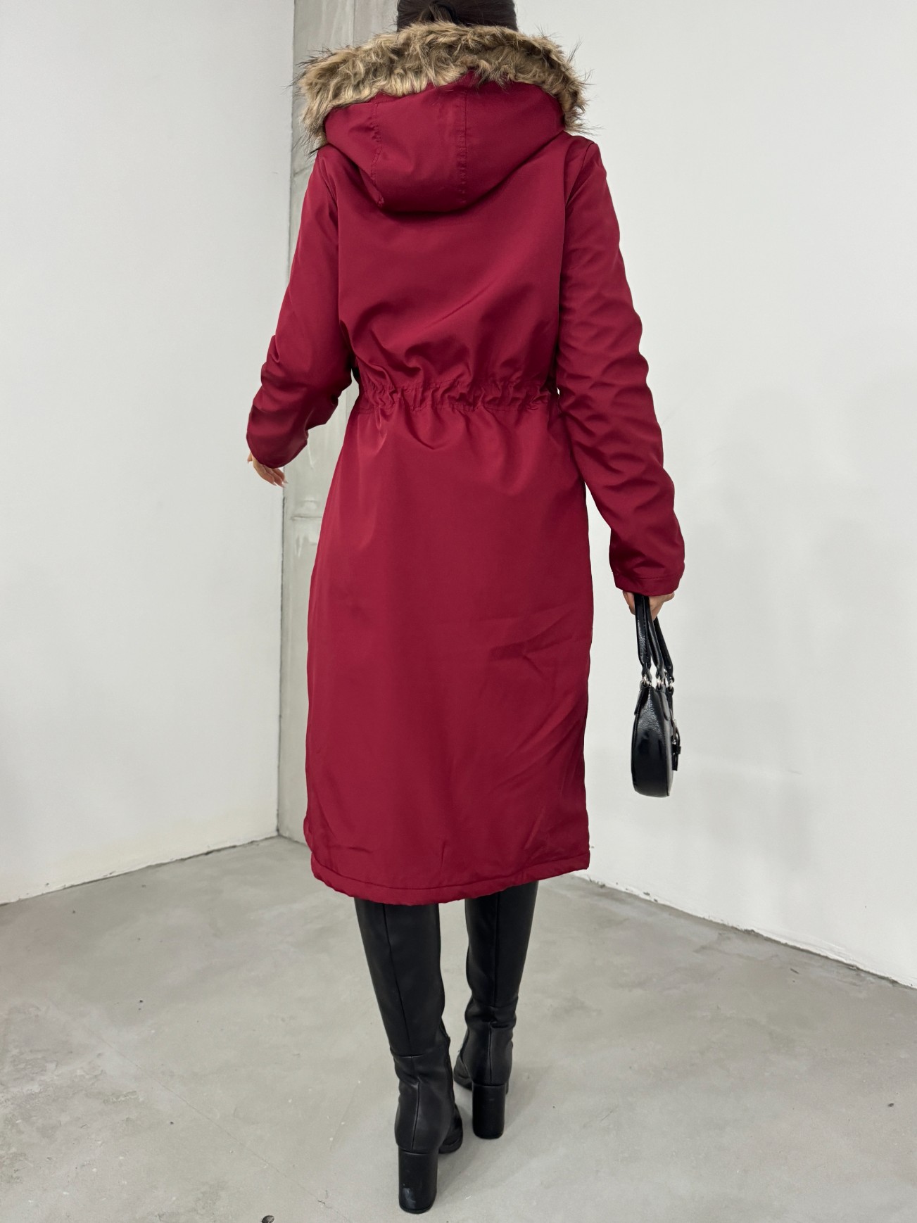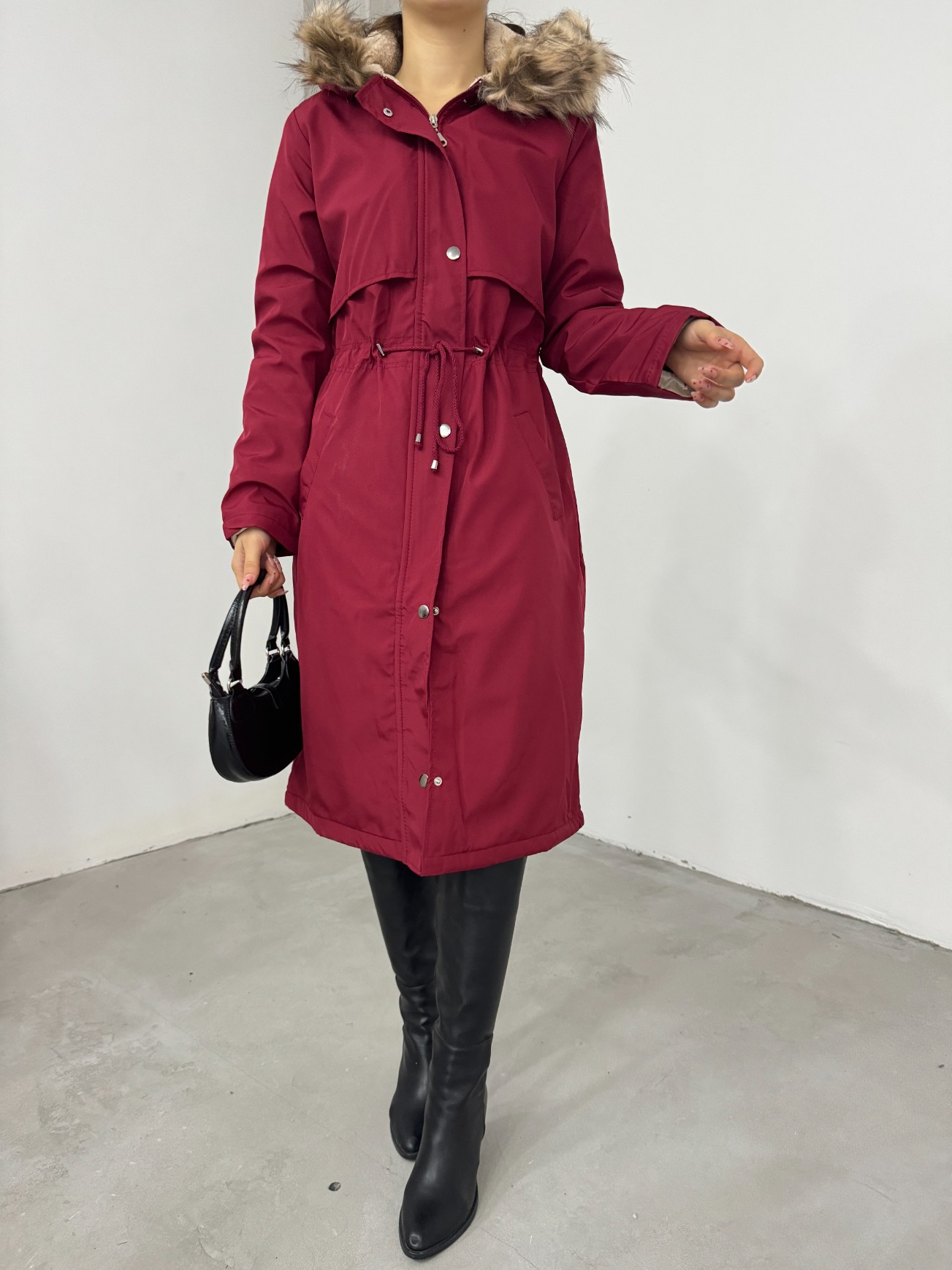 İçi Peluşlu Sabit kapşonlu Tünel Bağcıklı Uzun Mont -Bordo-Bordo