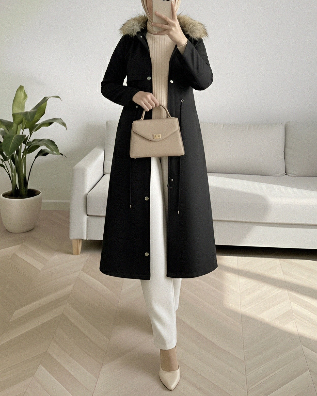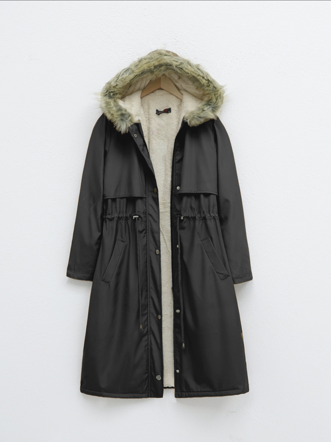 İçi Peluşlu Sabit kapşonlu Tünel Bağcıklı Uzun Mont -Siyah-Siyah