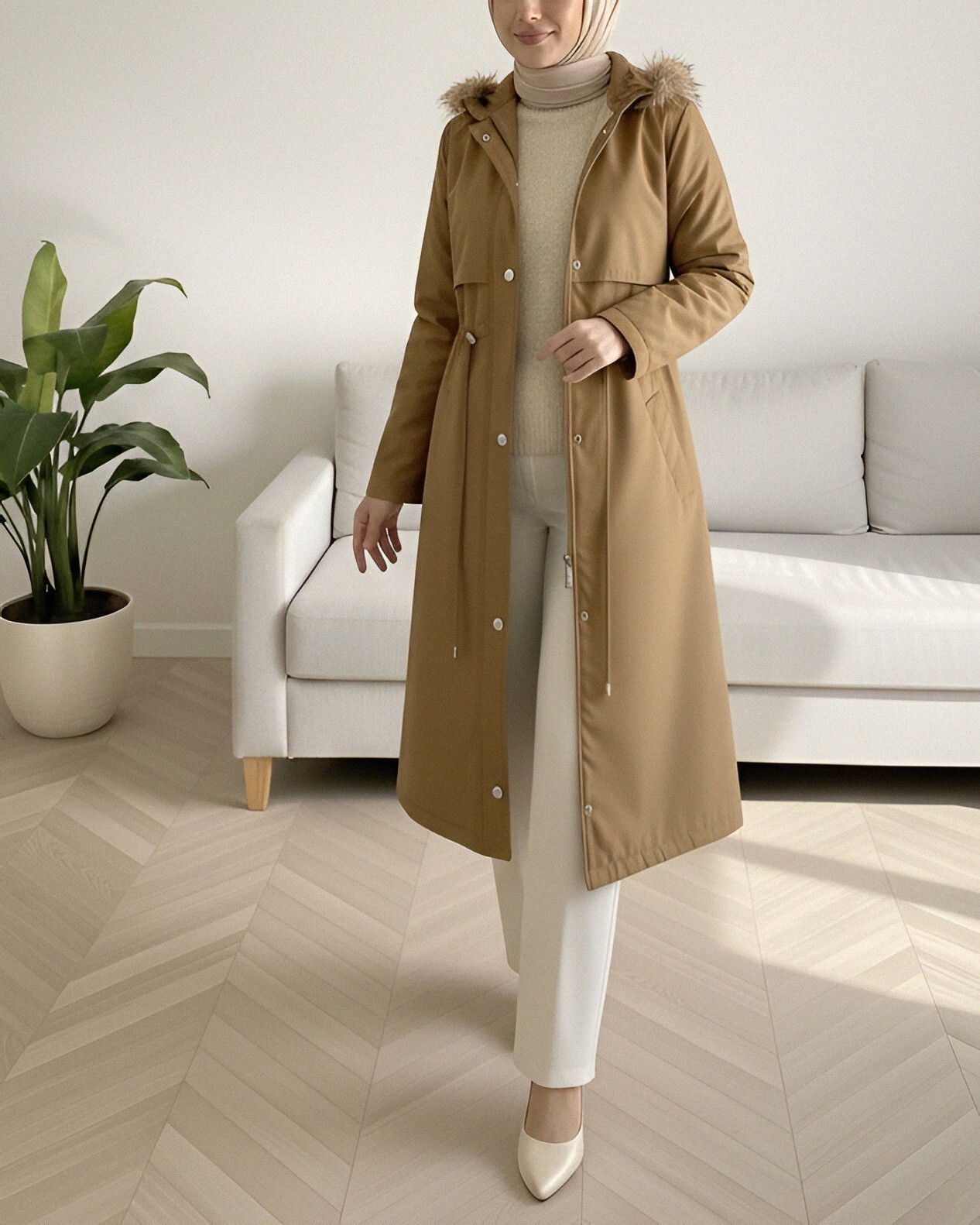 İçi Peluşlu Sabit kapşonlu Tünel Bağcıklı Uzun Mont -Vizon-Vizon