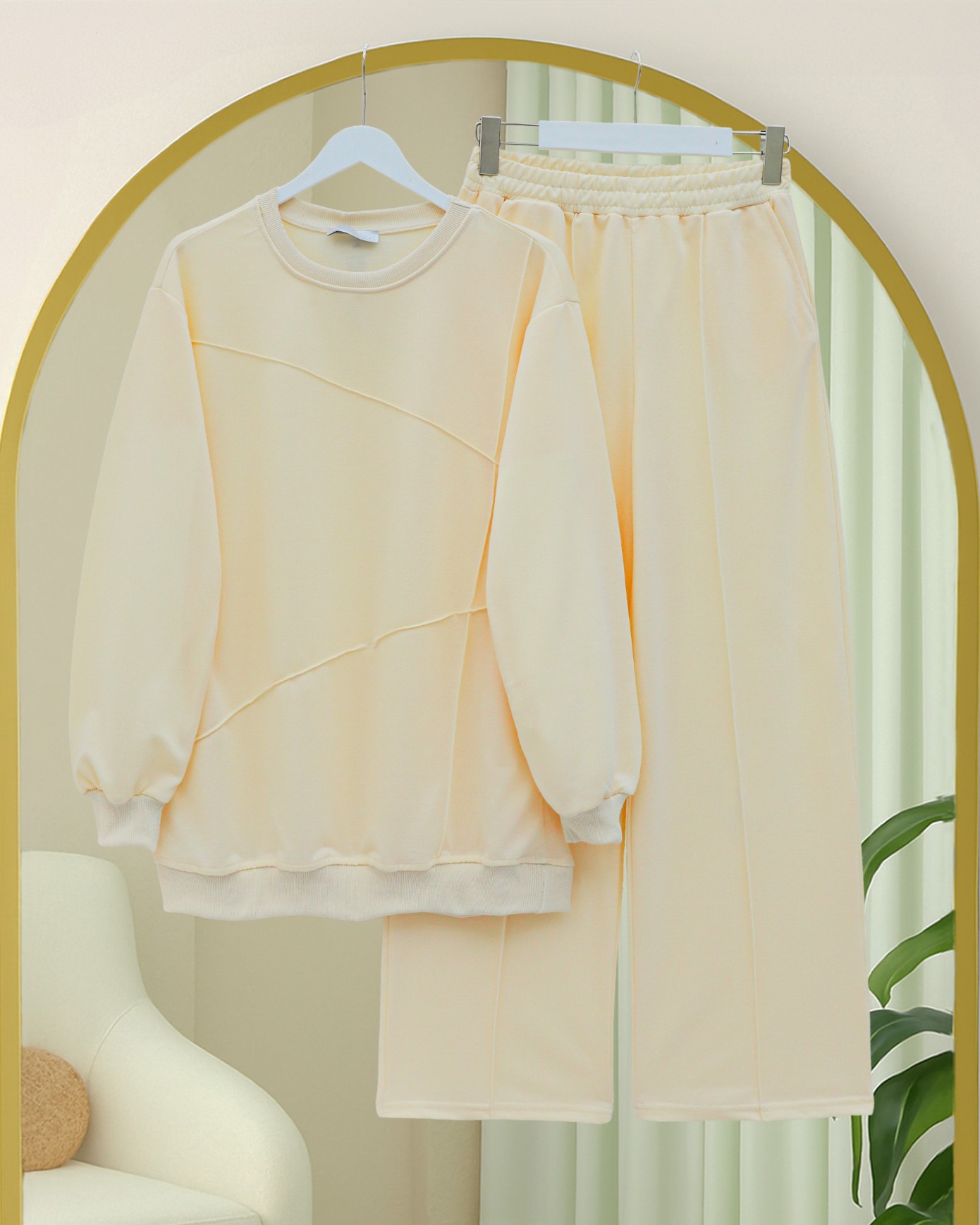 İki İp Çimalı Pantolonlu Penye Takım -Bej-Bej