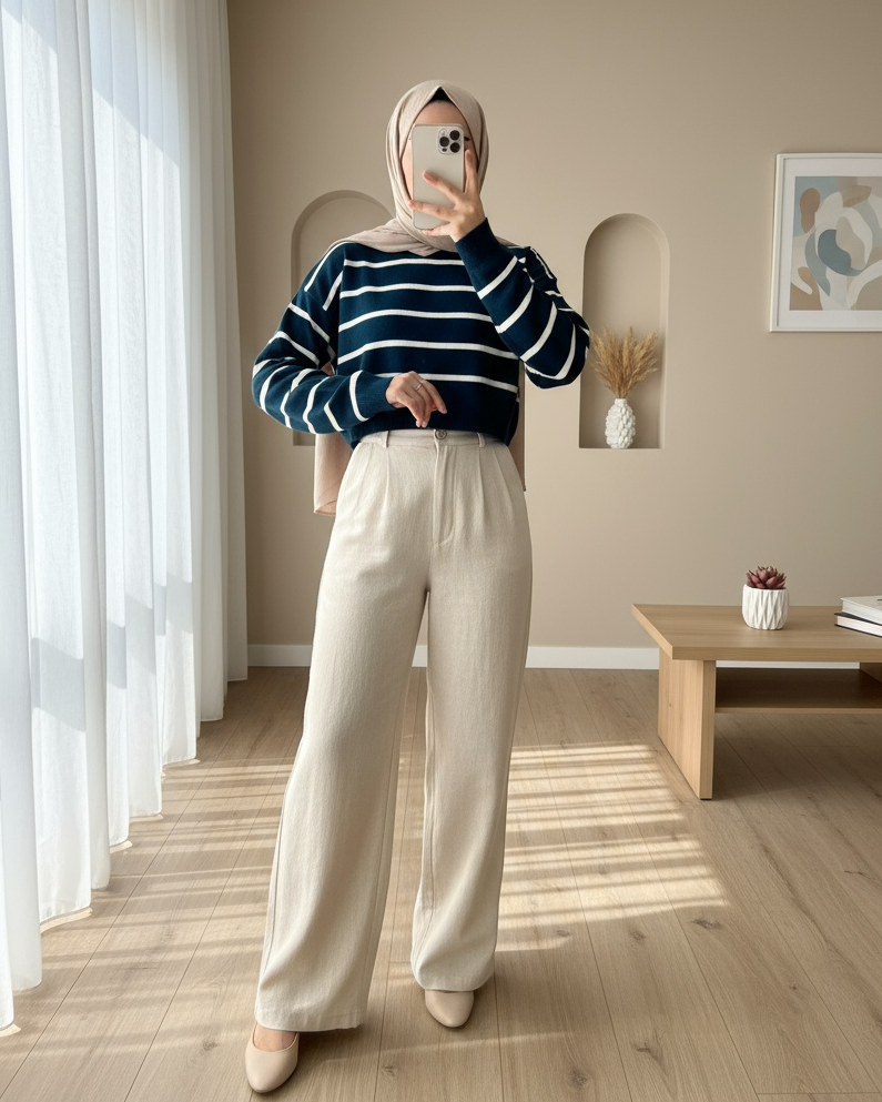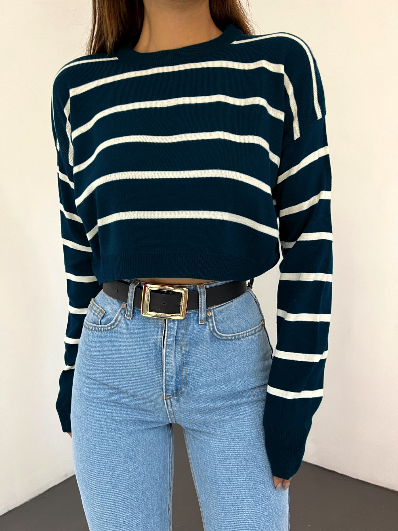 İnce Çizgili Crop Triko Kazak -Laci-Lacivert