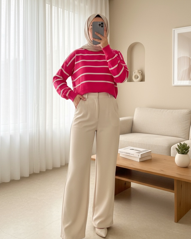 İnce Çizgili Crop Triko Kazak -Nar Çiçeği-Nar Çiçeği