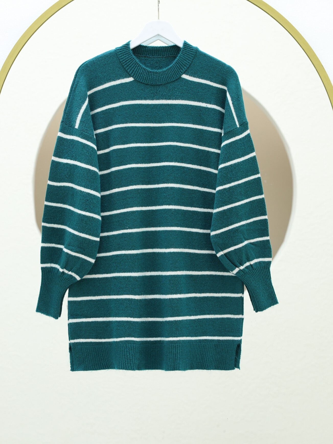 İnce Çizgili Yırtmaçlı Triko Tunik -Zümrüt-Zümrüt