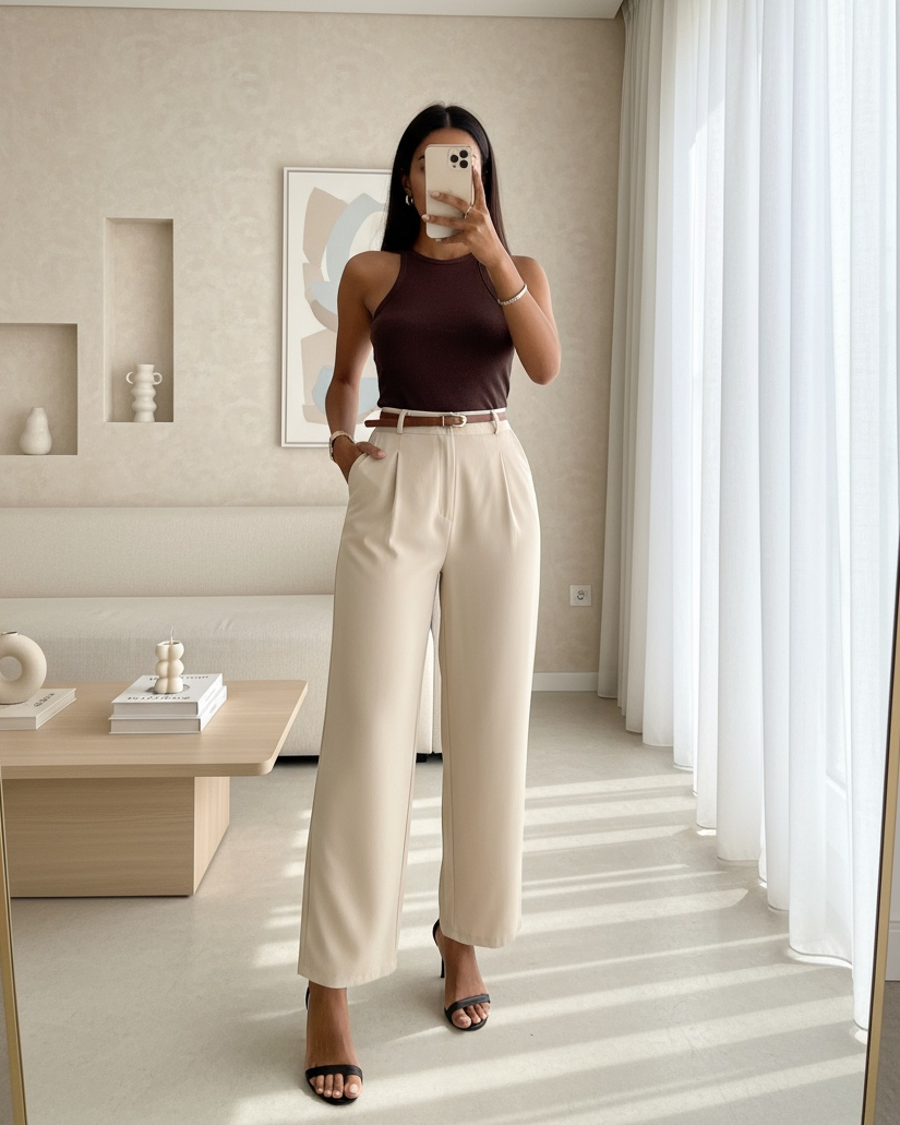 İnce Kemerli Cepli Paçası Dikişli Pantolon -Bej-Bej