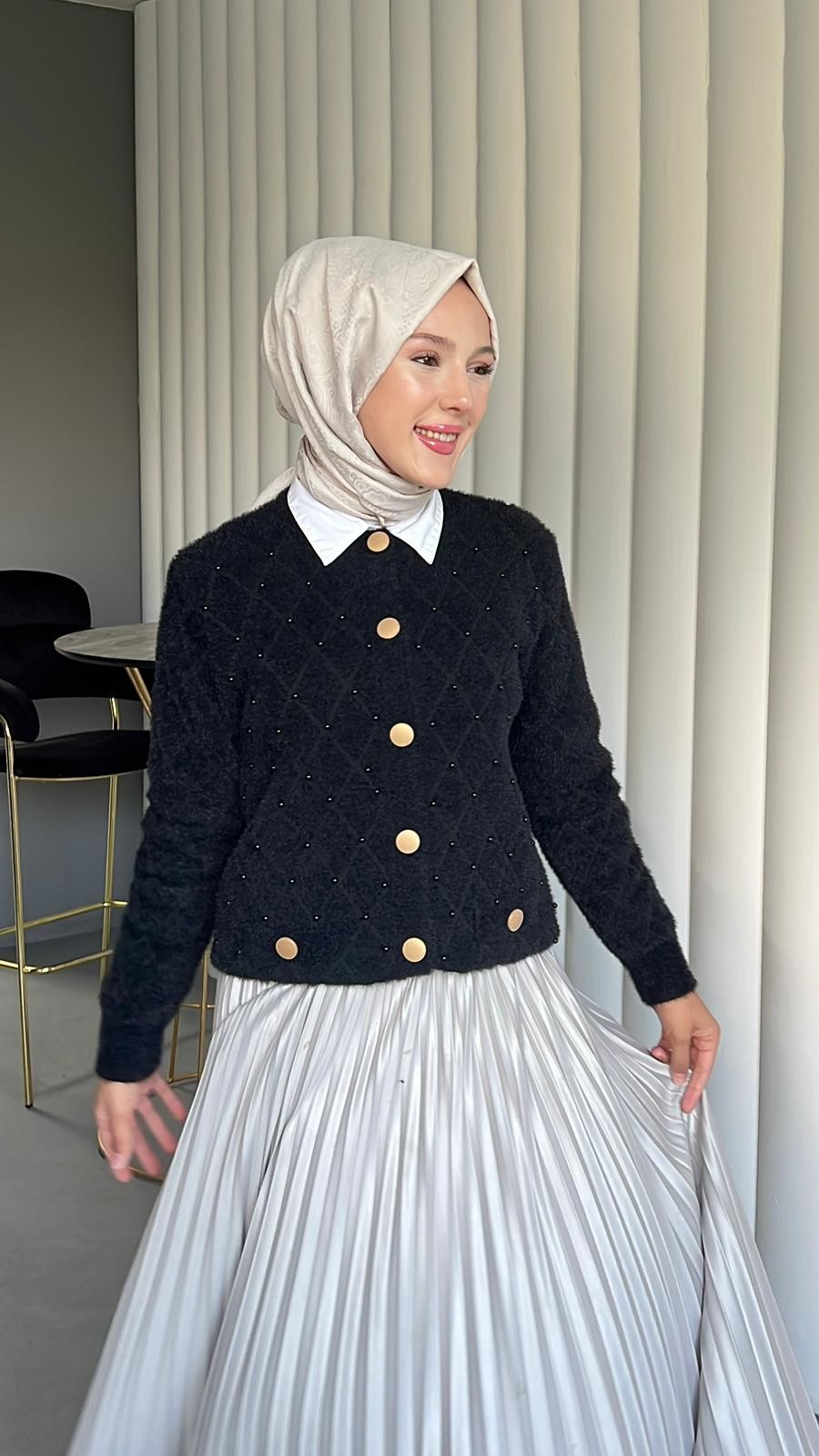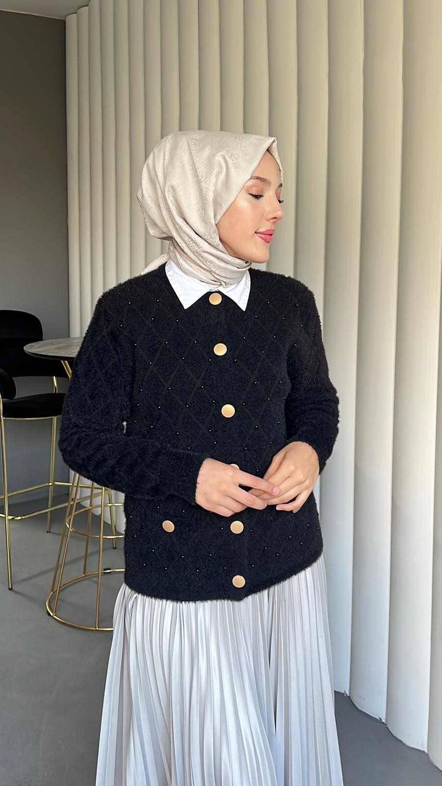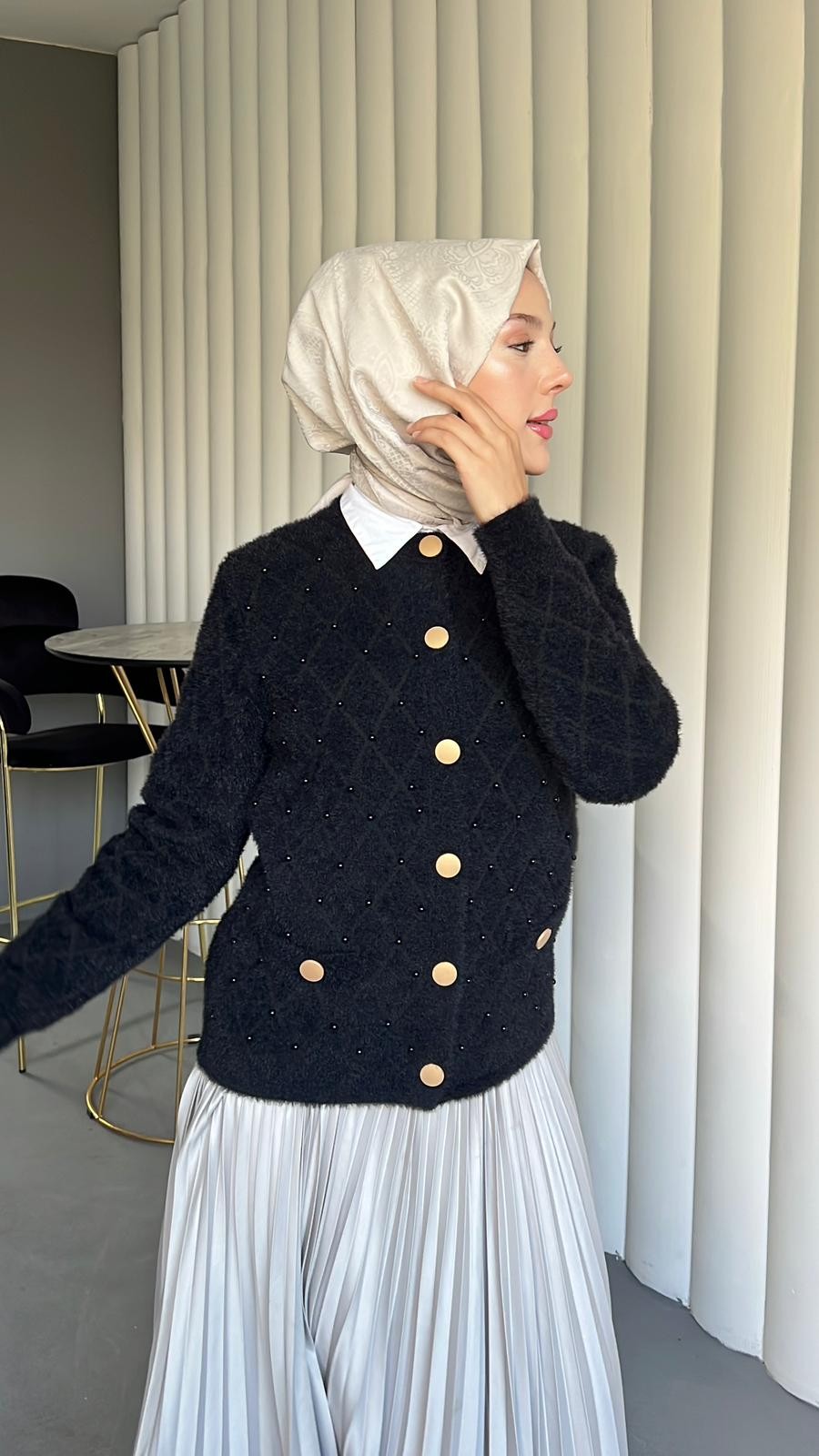 İnci Detaylı Düğmeli Baklava Desenli Hırka -Siyah-siyah