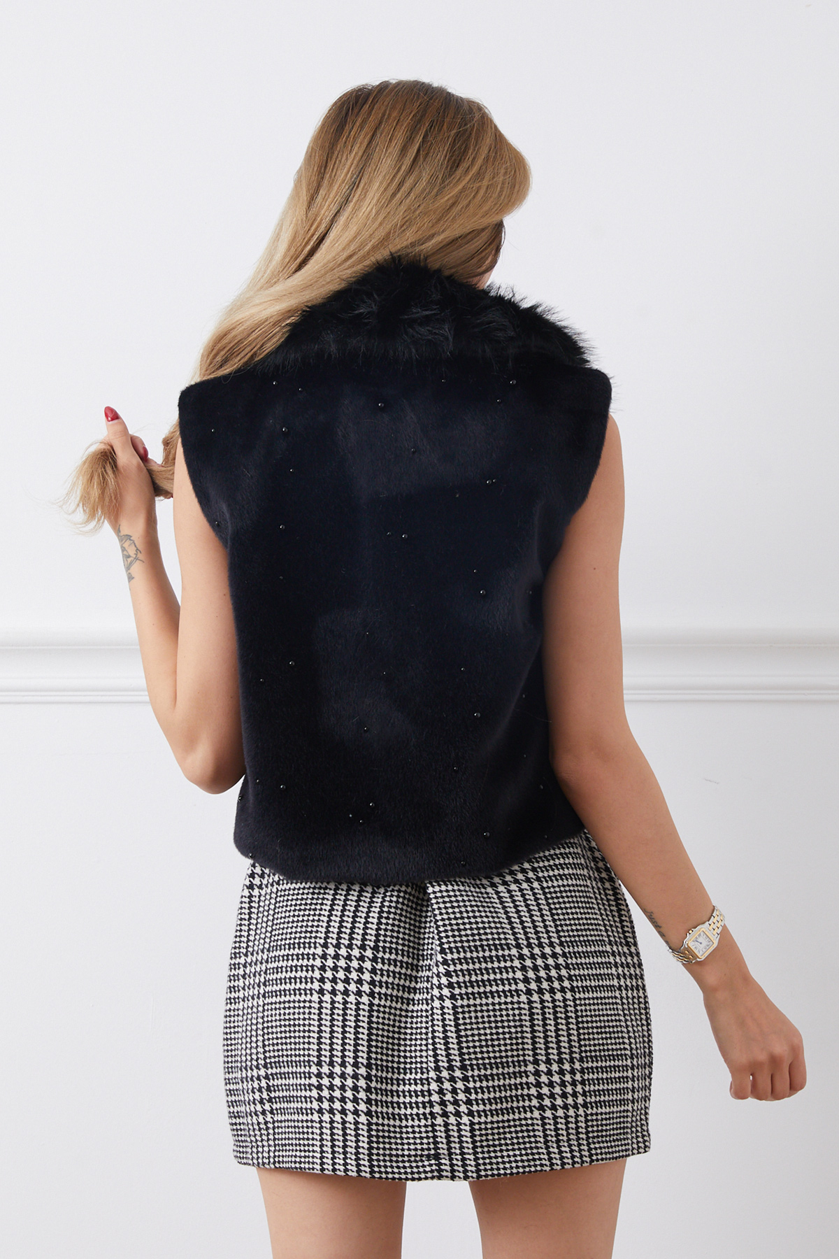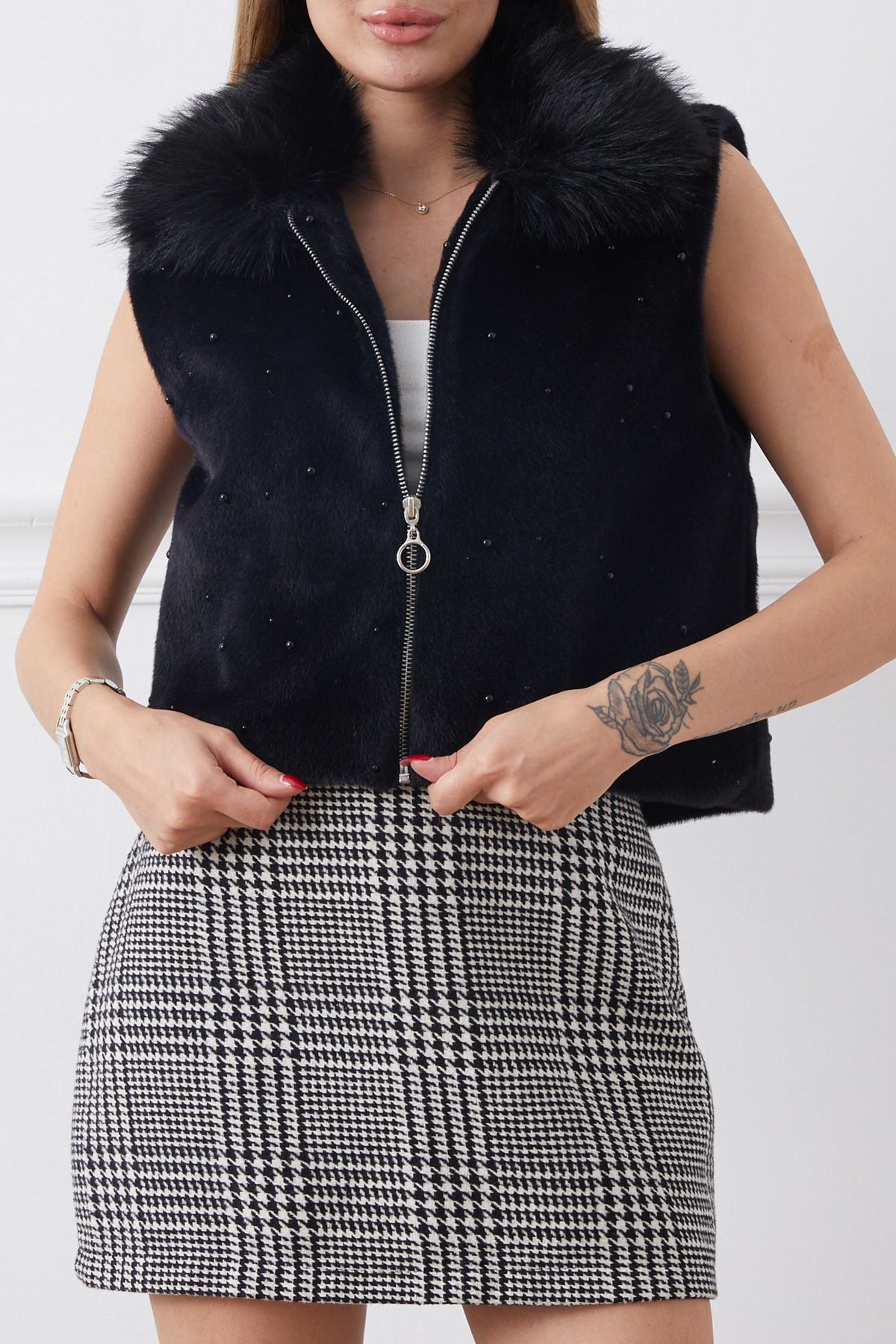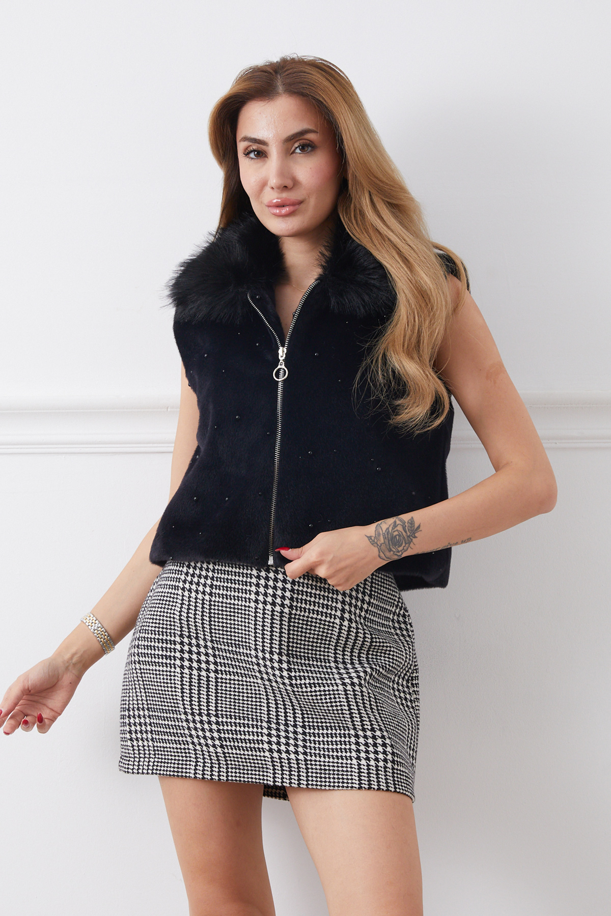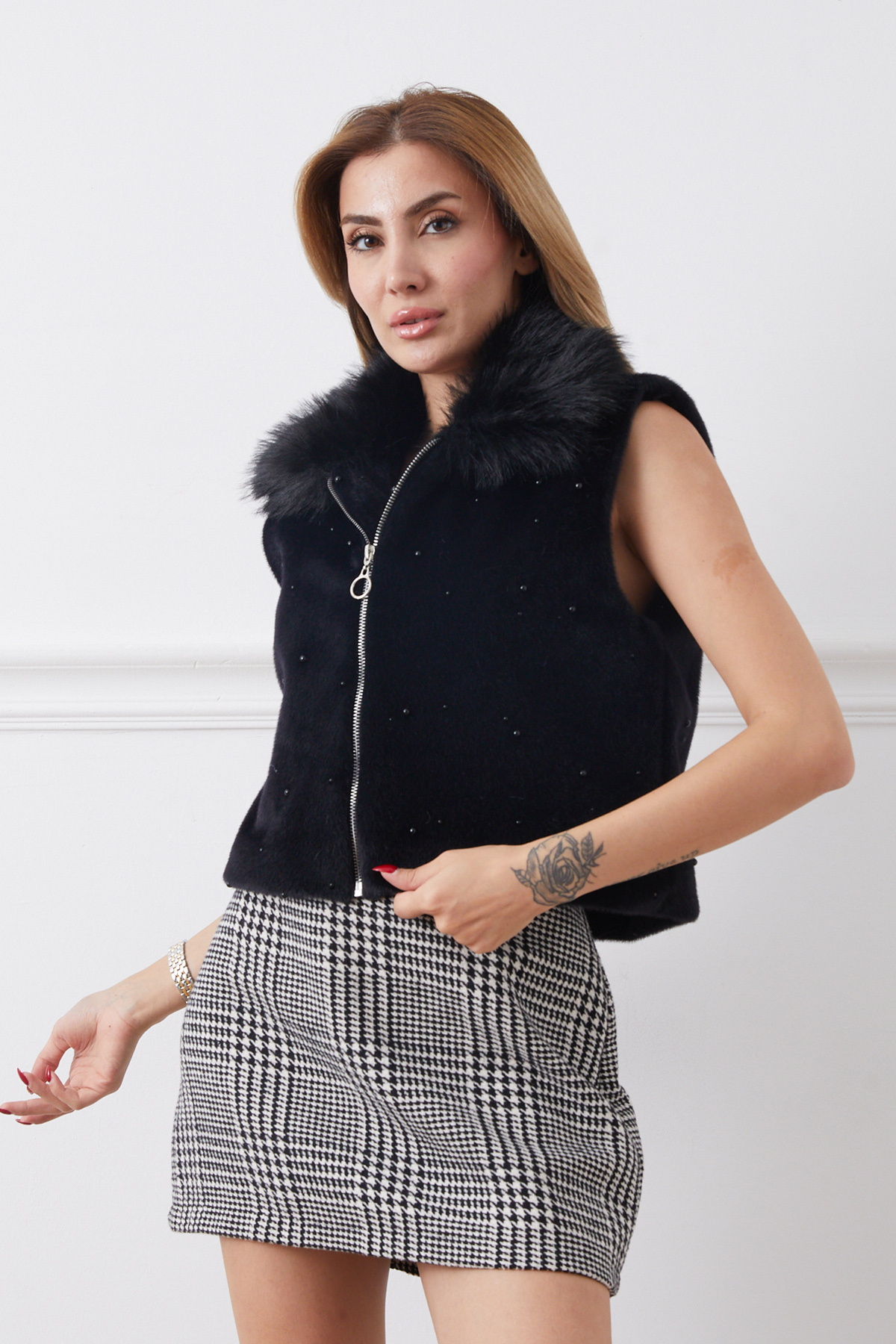 İnci Detaylı Fermuarlı Kürk Yelek-Siyah