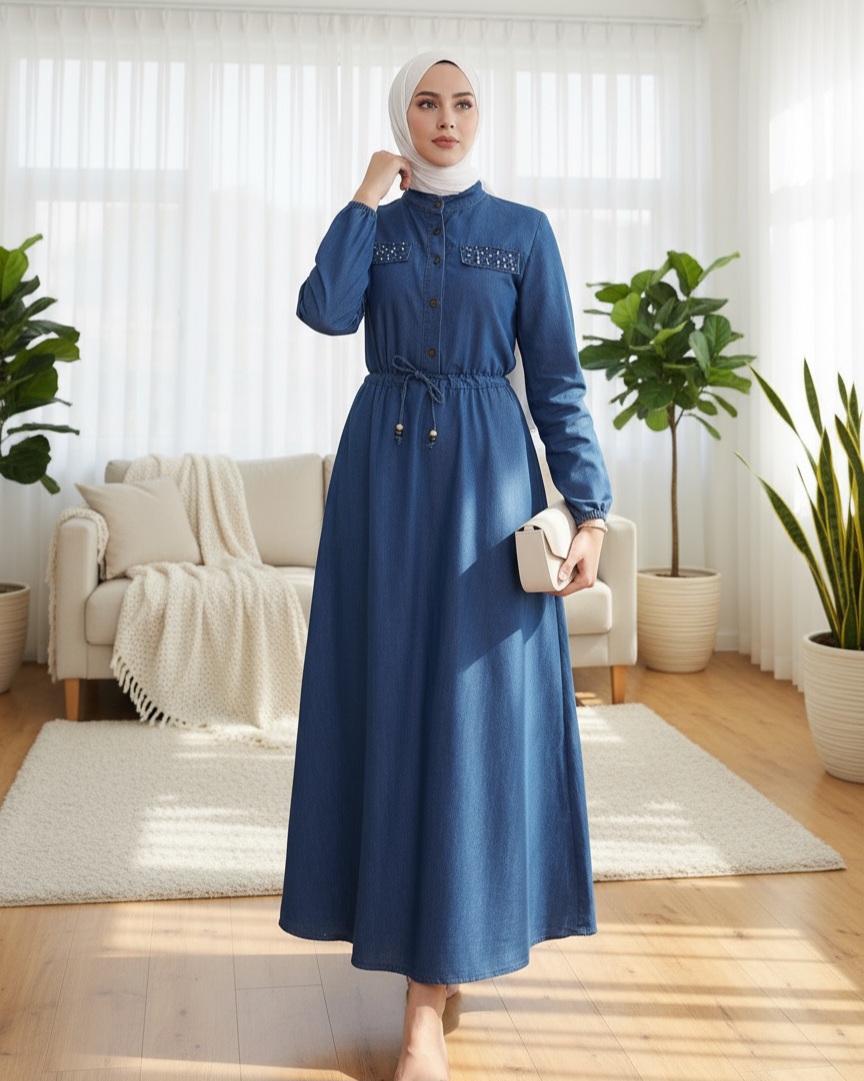 İnci Detaylı Tünel Bağcıklı Uzun Kot Elbise -İndigo-İndigo