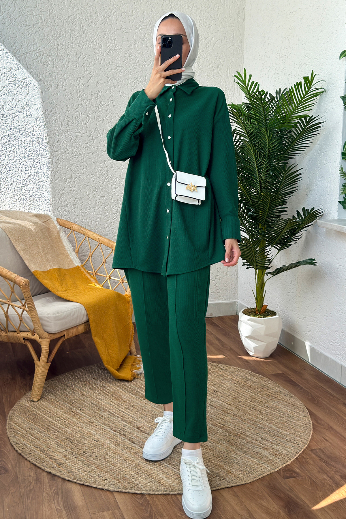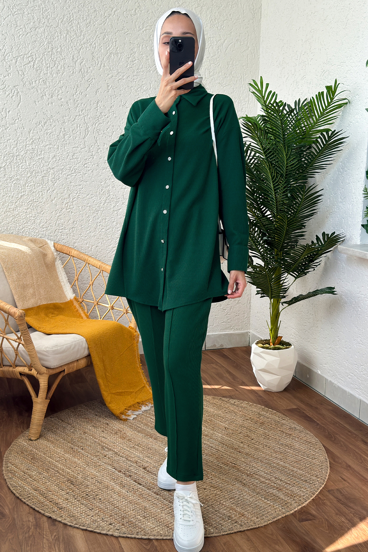 İnci Düğme Detaylı İkili Takım-Yeşil