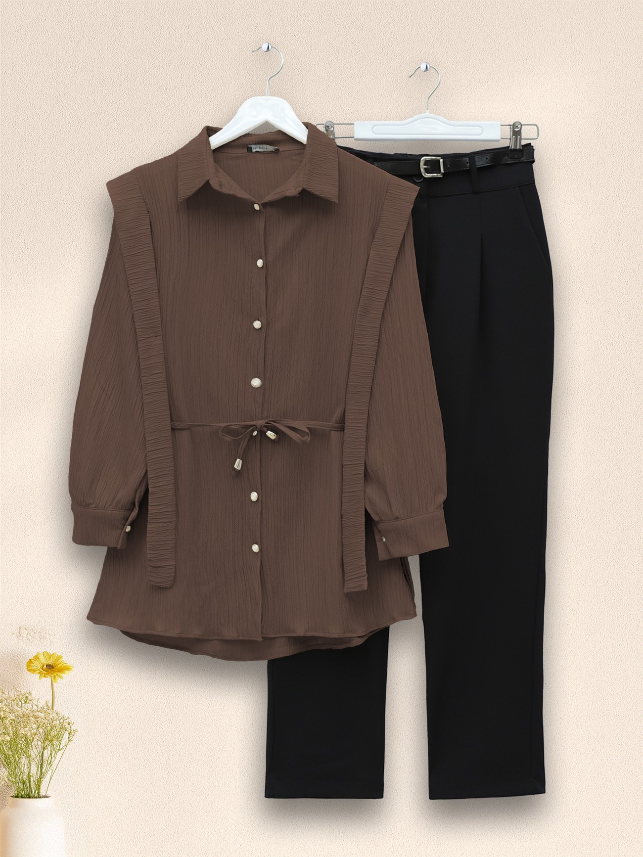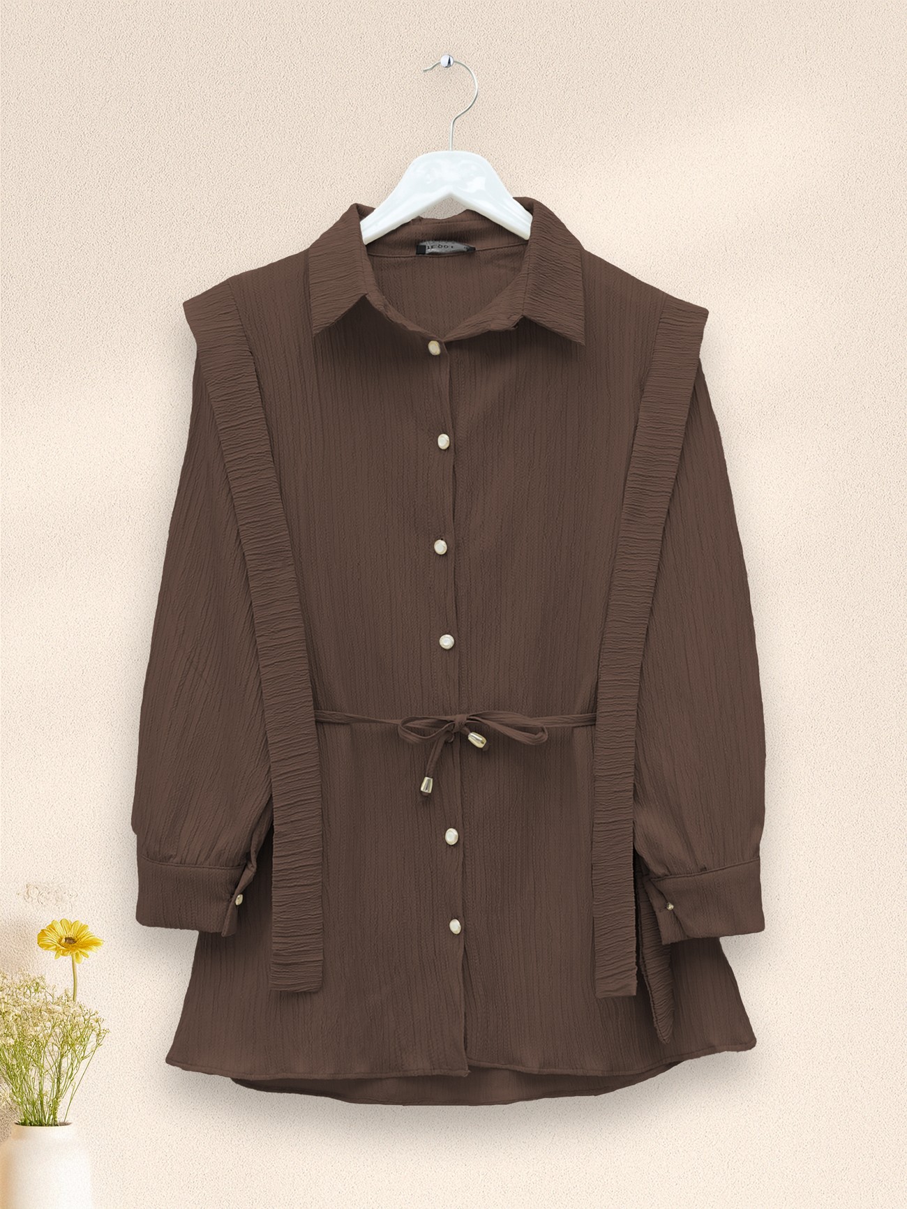 İnci Düğmeli Omuzu Ve Beli Bağlamalı Krinkıl Gömlek -Kahve-Kahve