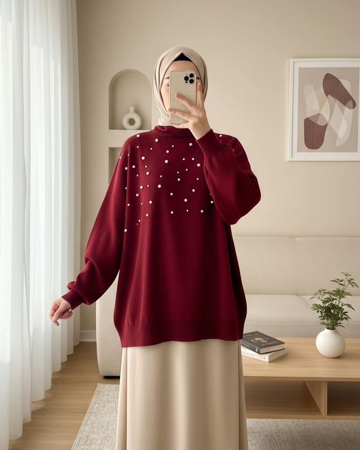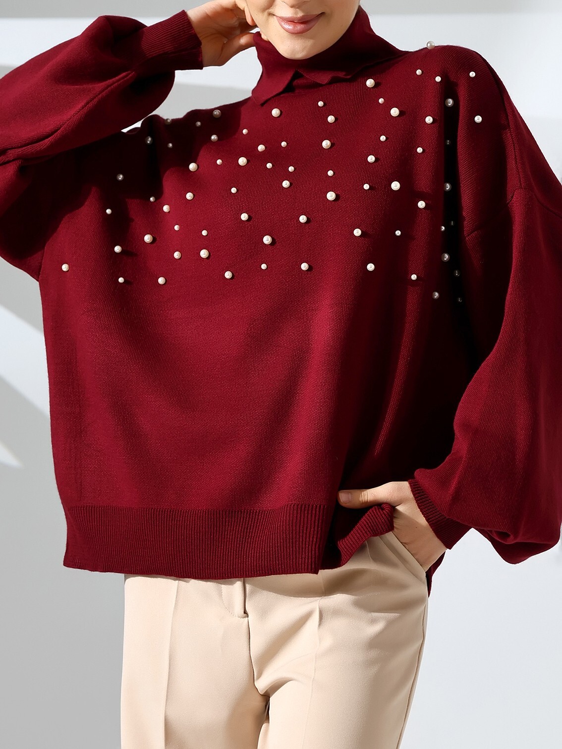 İncili Balıkçı Yaka Balon Kol Triko -Bordo-Bordo