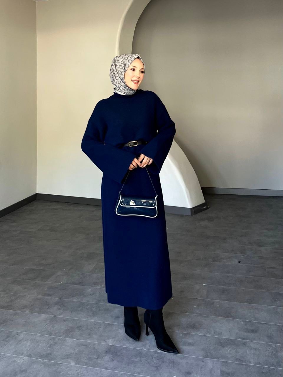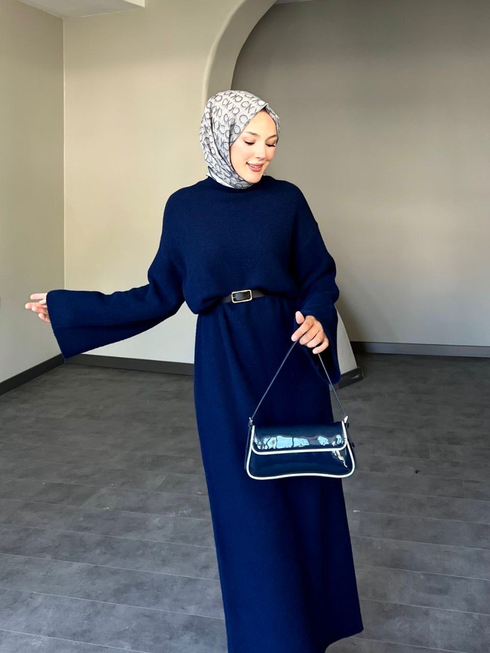 İspanyol Kol Triko Uzun Elbise -Laci-Lacivert