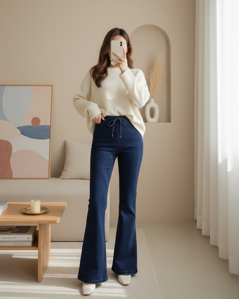 İspanyol Paça Bağcık Detaylı Kot Pantolon -İndigo-İndigo