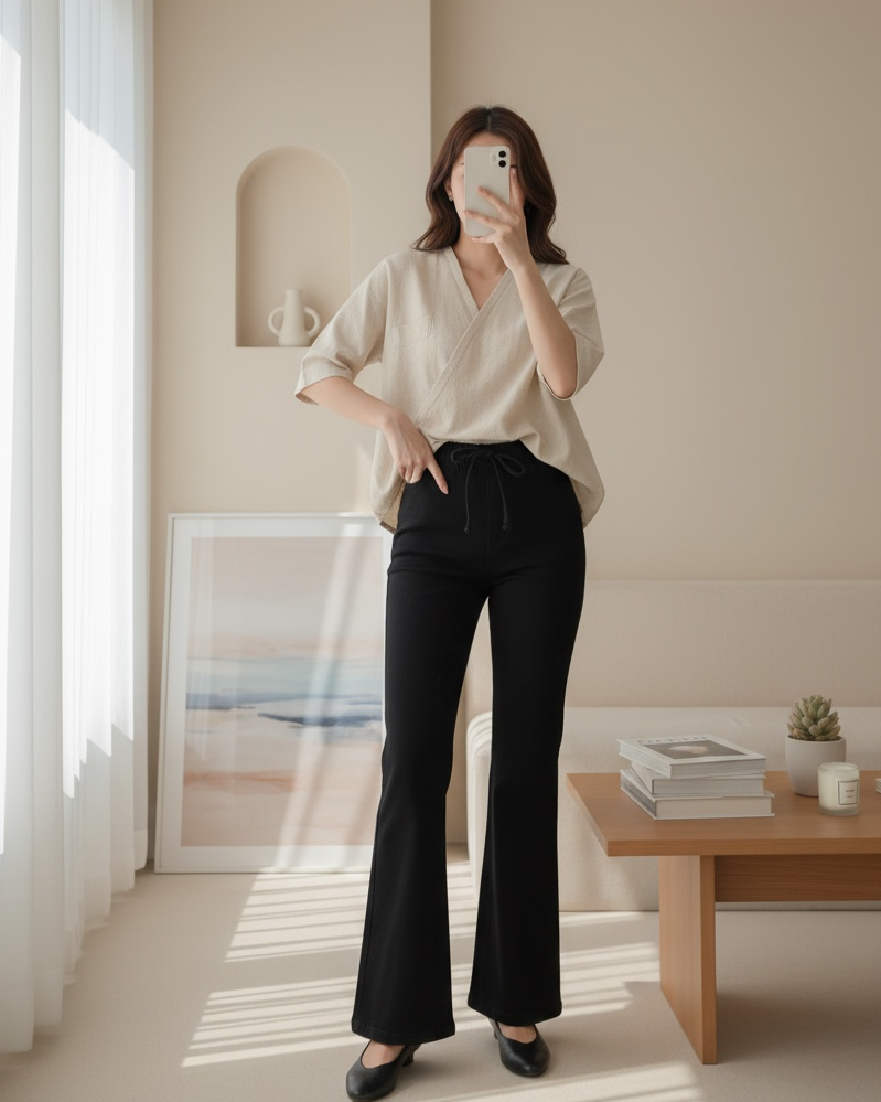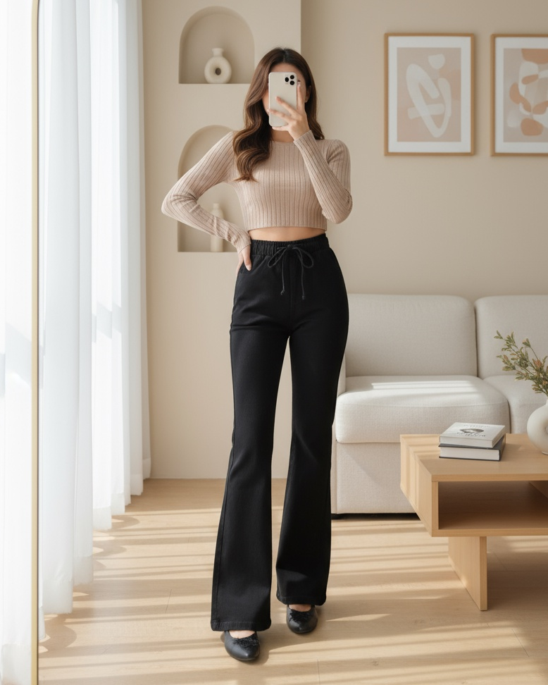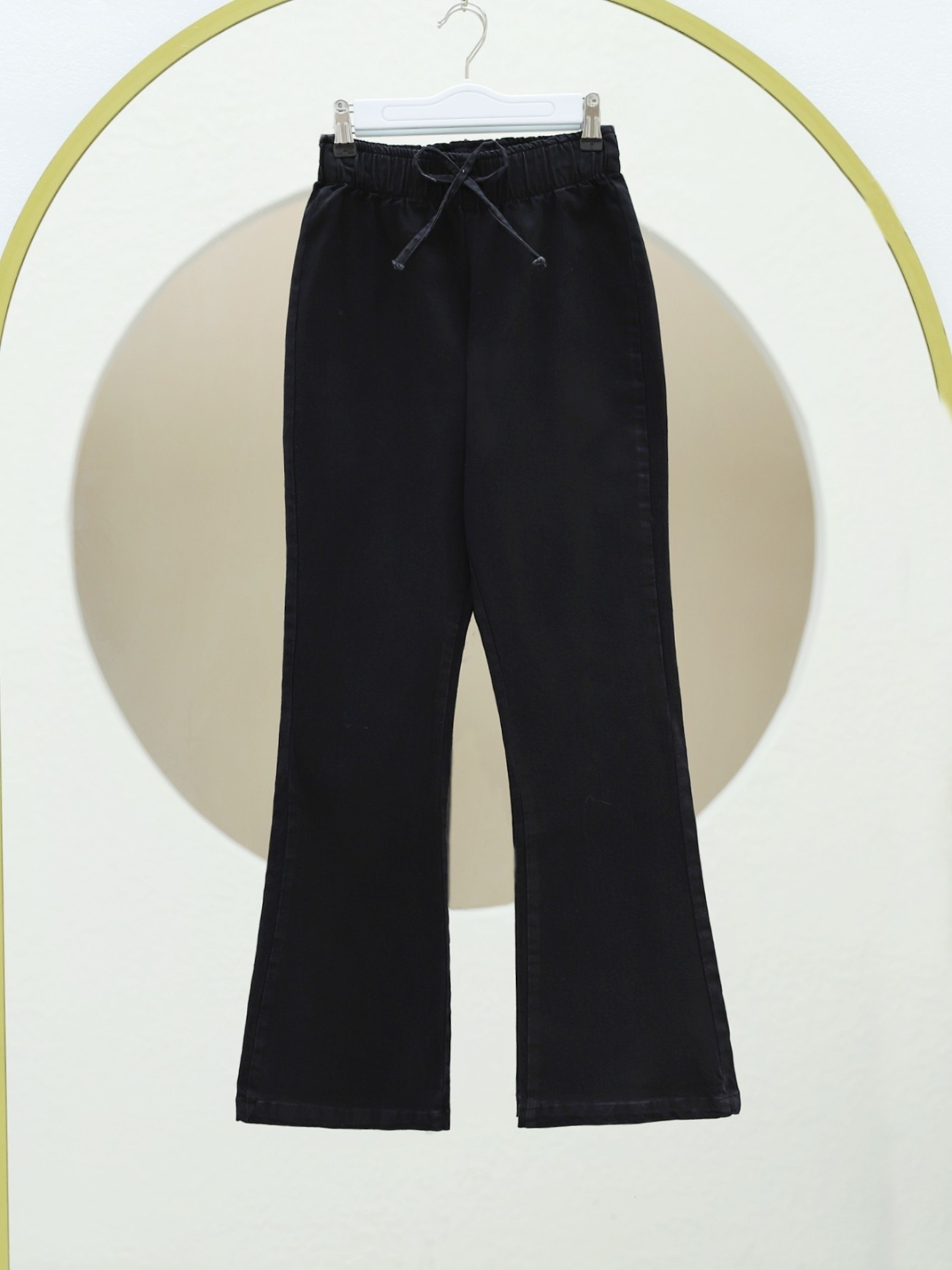 İspanyol Paça Bağcık Detaylı Kot Pantolon -Siyah-Siyah