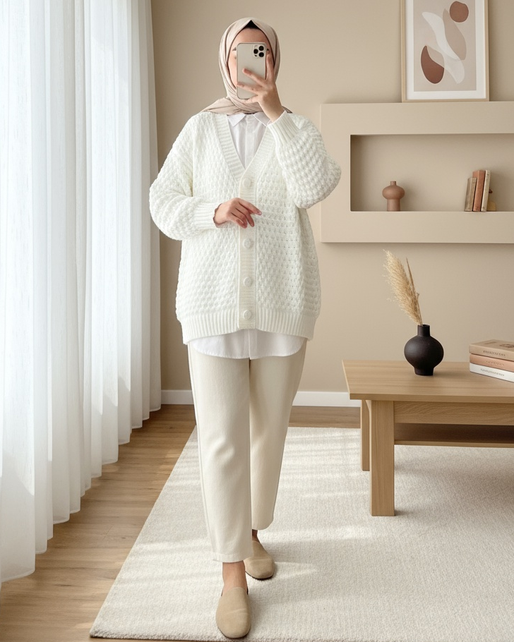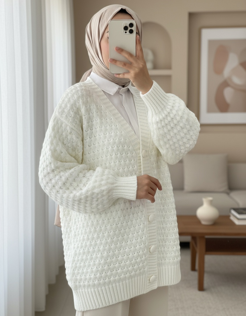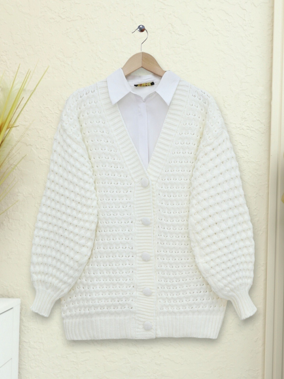 Kabartma Örgülü Araboy Düğmeli Triko Hırka -Ekru-Ekru