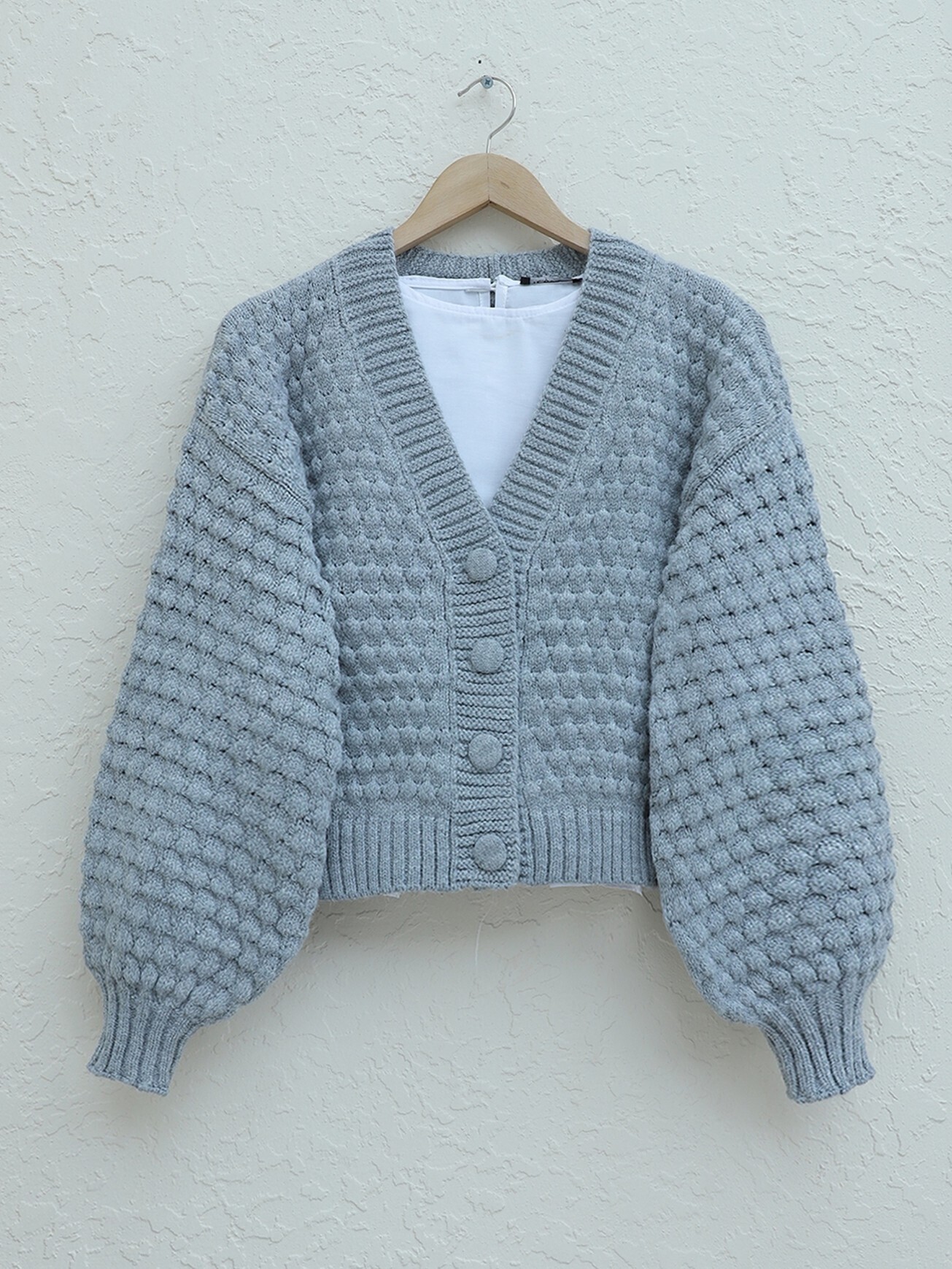 Kabartma Örgülü Düğmeli Triko Hırka -Gri-Gri