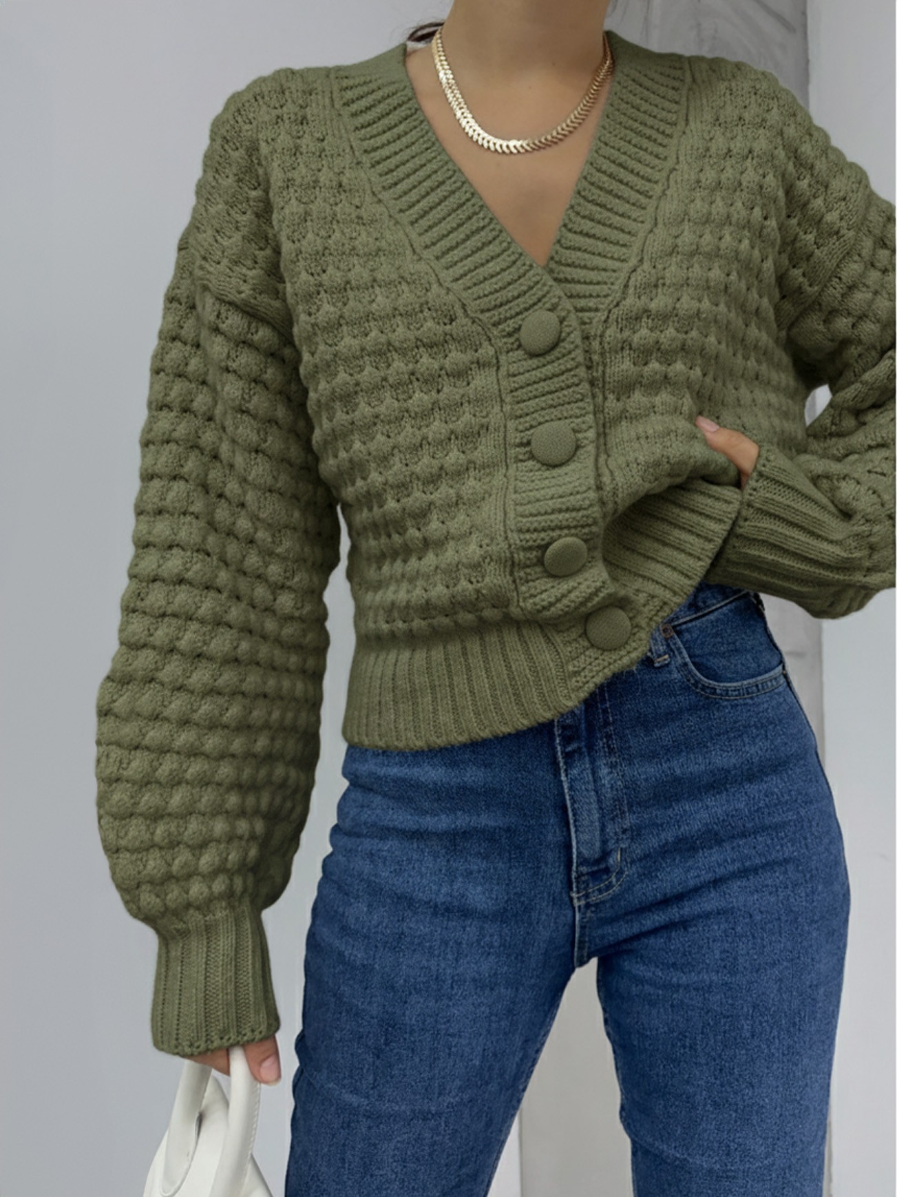 Kabartma Örgülü Düğmeli Triko Hırka -Haki-Haki