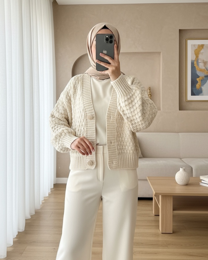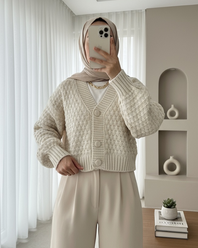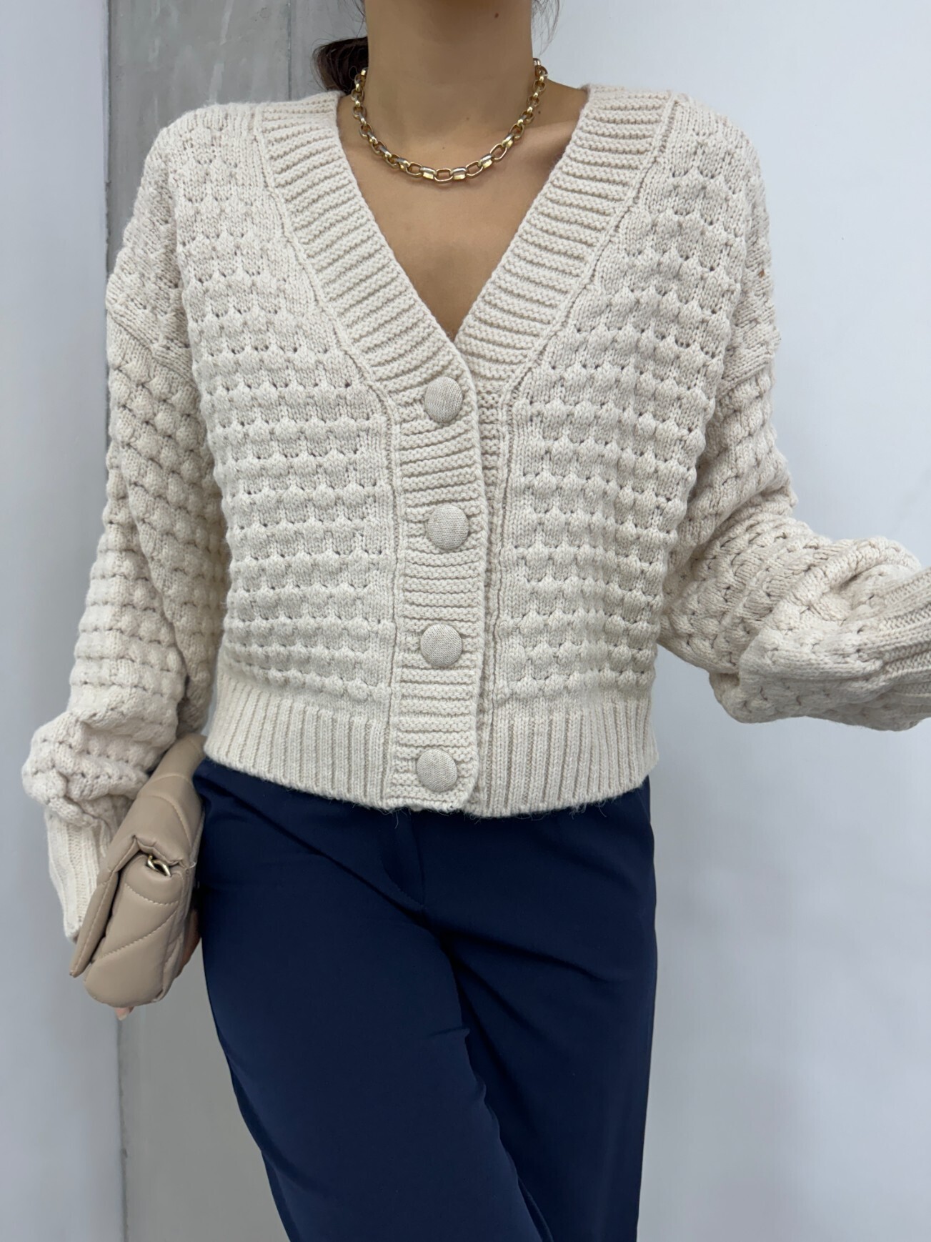 Kabartma Örgülü Düğmeli Triko Hırka -Krem-Krem
