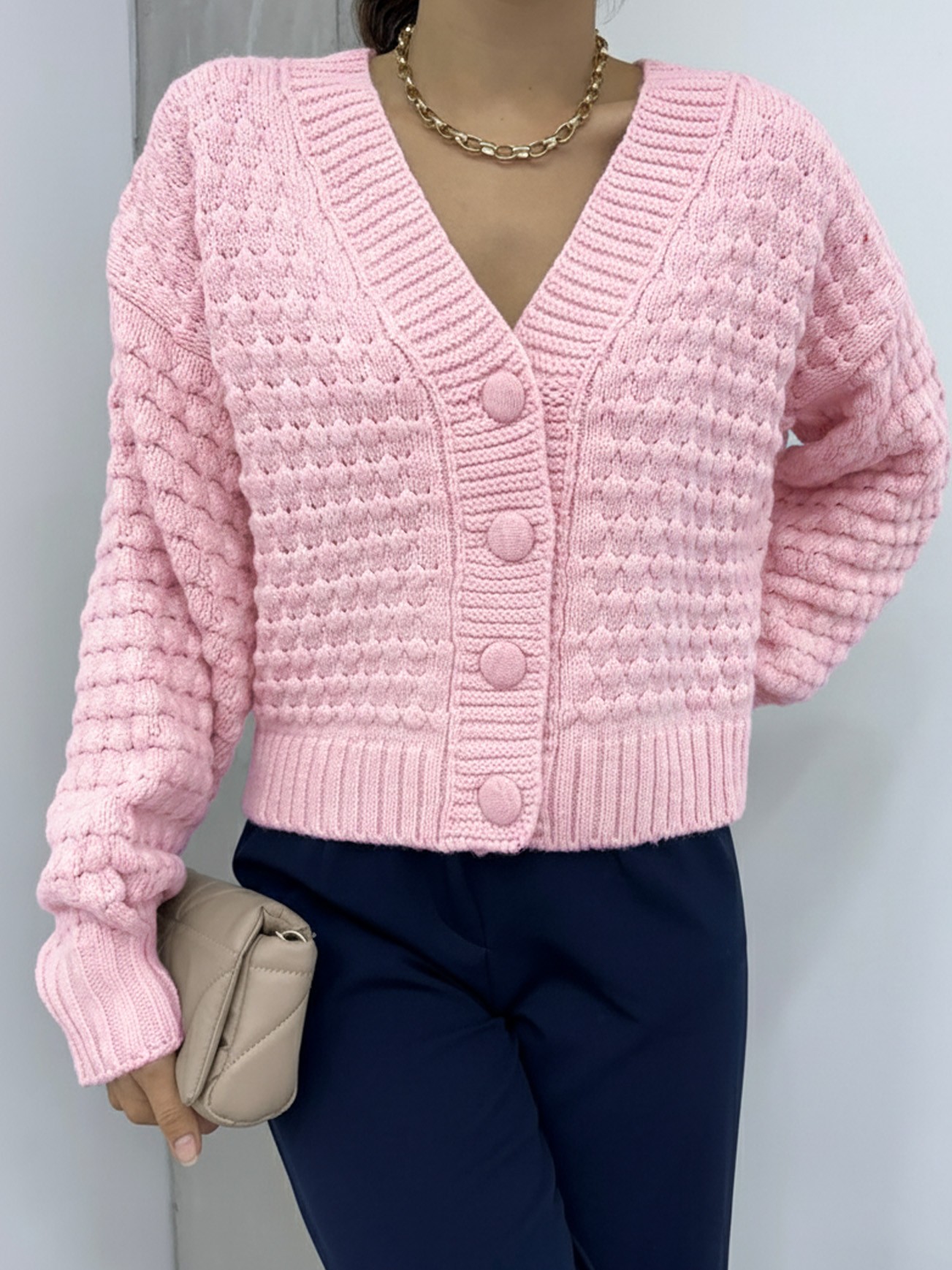 Kabartma Örgülü Düğmeli Triko Hırka -Pudra-Pudra