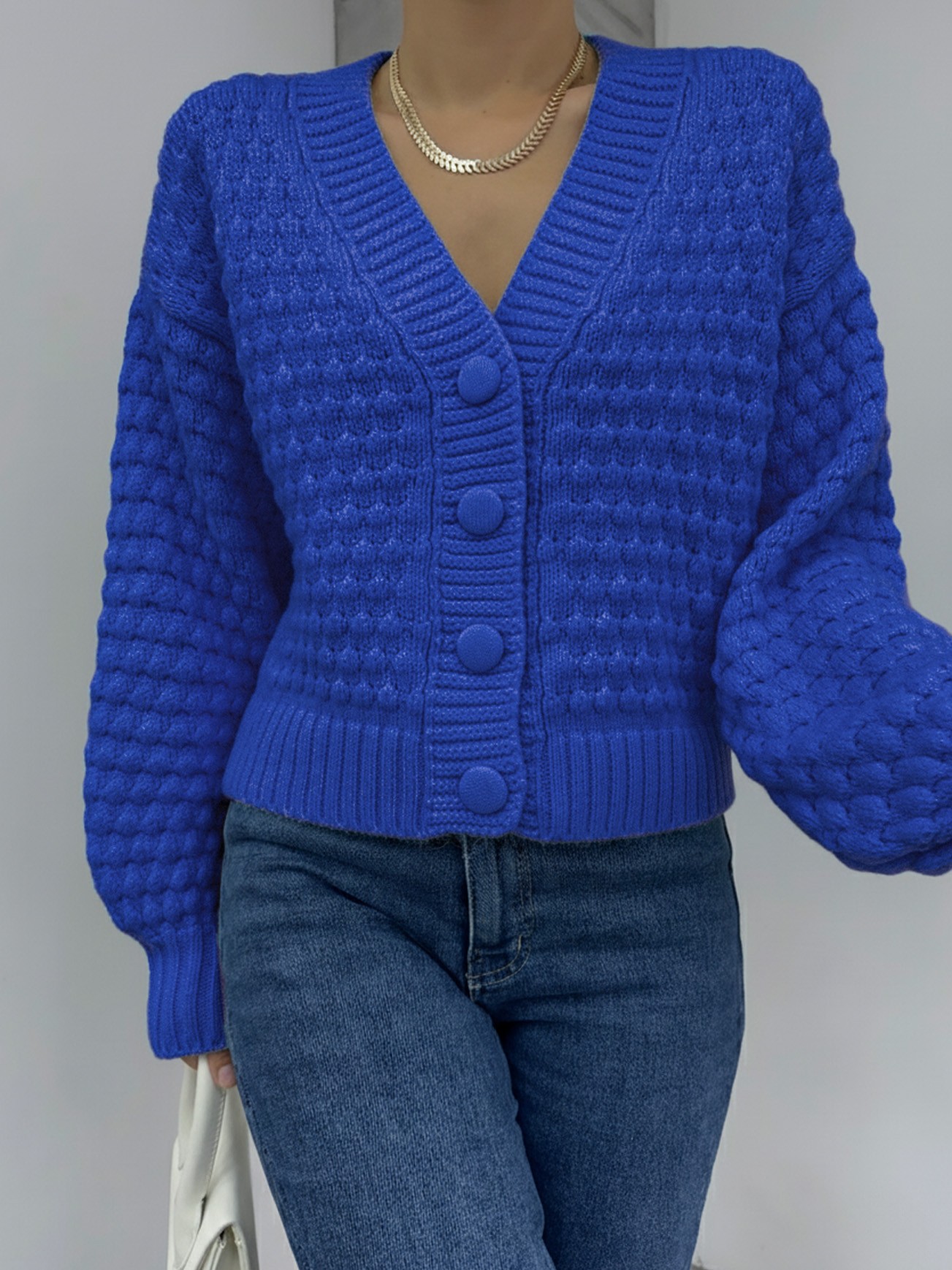 Kabartma Örgülü Düğmeli Triko Hırka -Saks-Saks