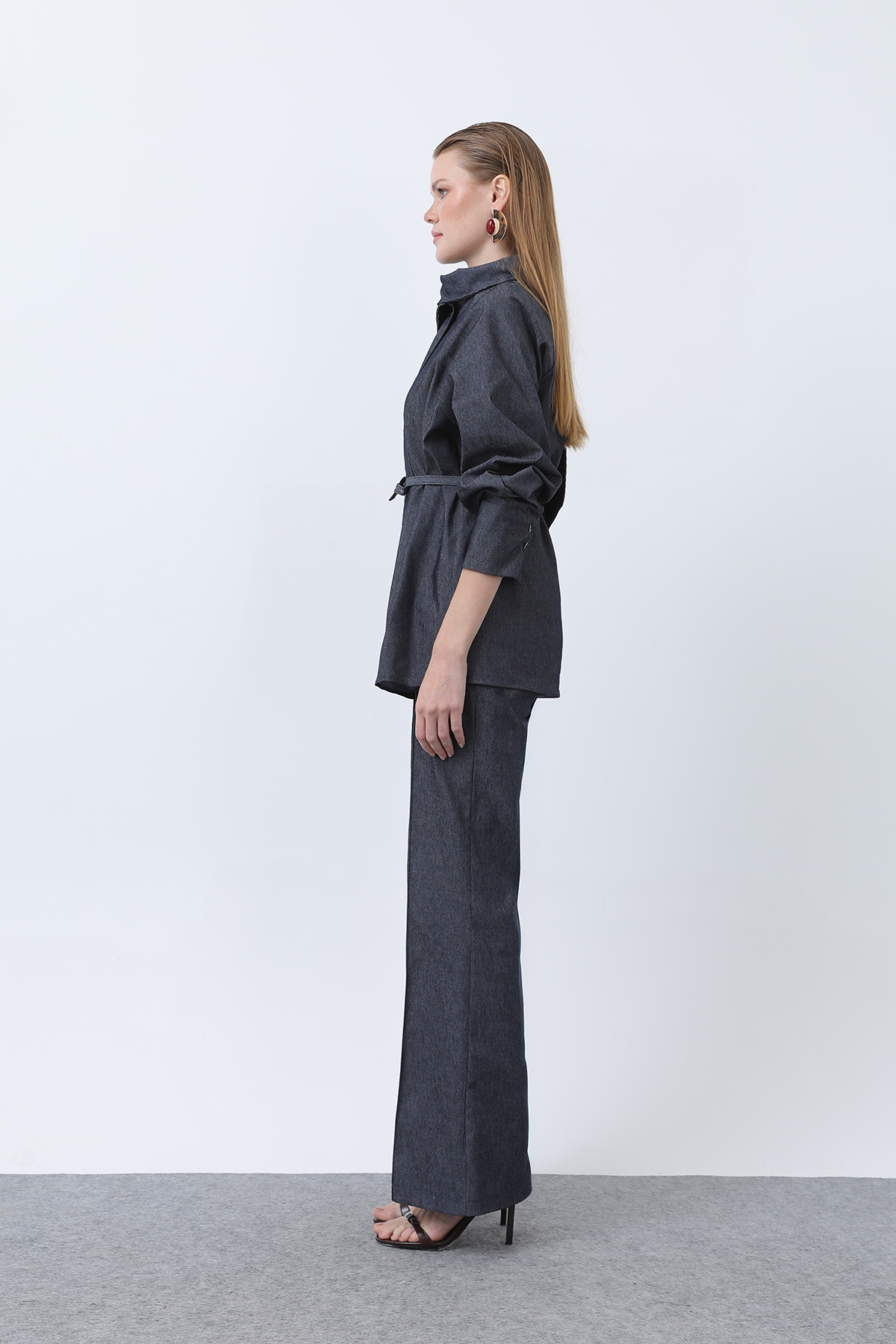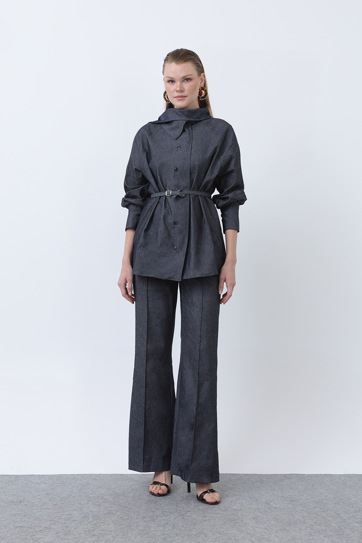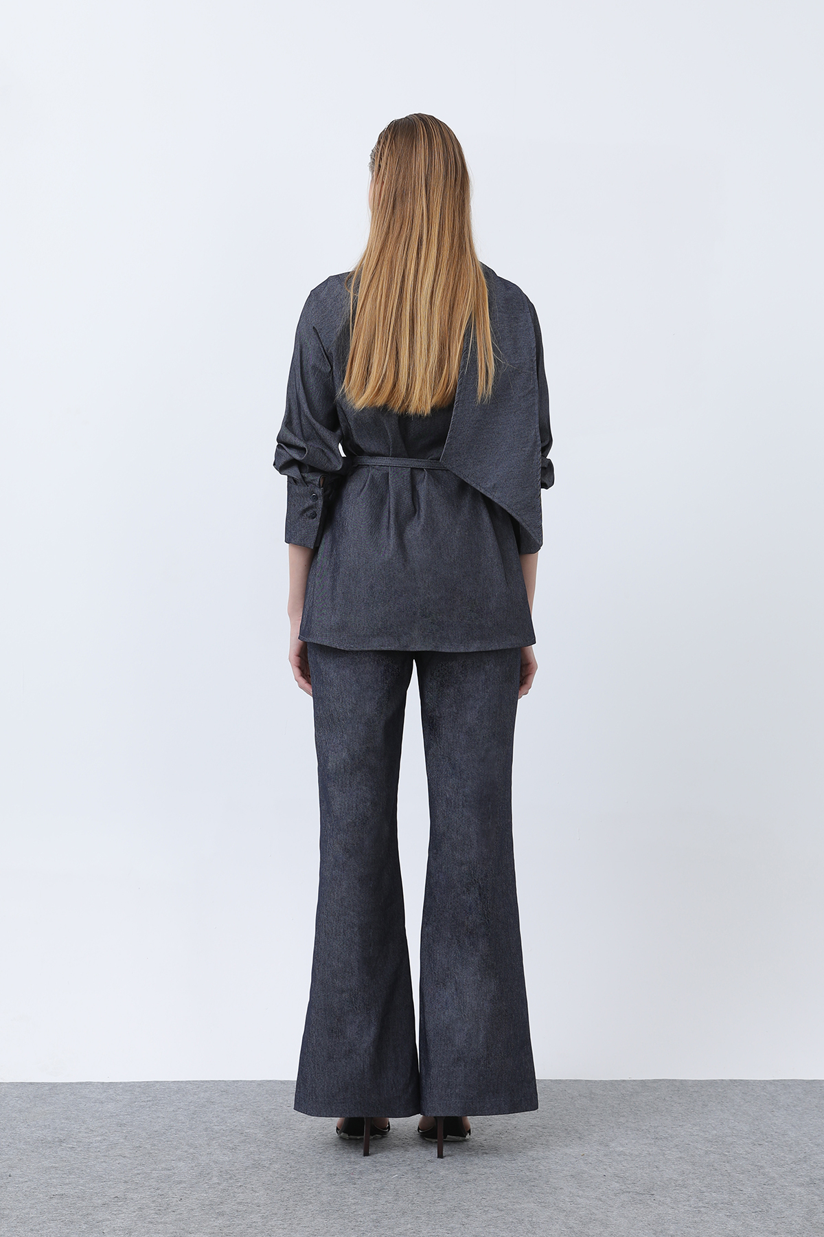 Kadın Kruvaze Yaka Kemer Detaylı Pantolonlu Denim Takım - 20652TKS-Mor