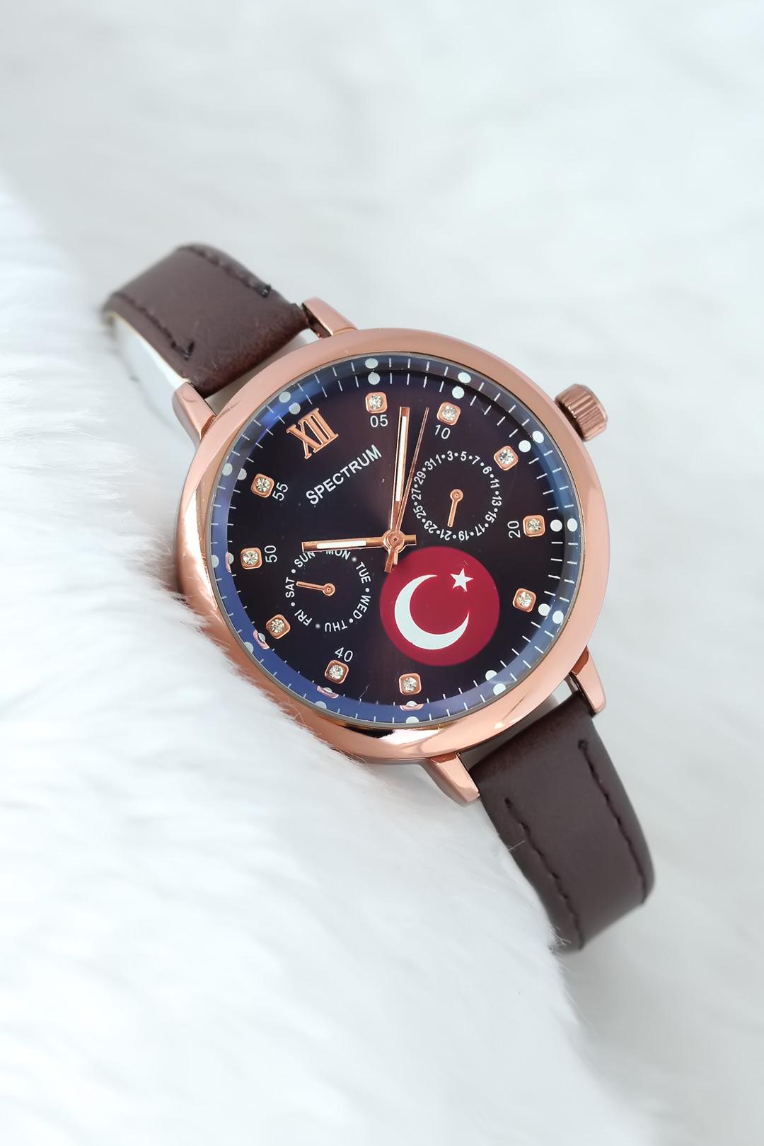 Kahverengi Deri Kordonlu Rose Renk Metal Kasa Türk Bayrak Tasarımlı Bayan Kol Saati-Kahverengi
