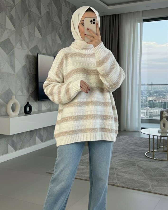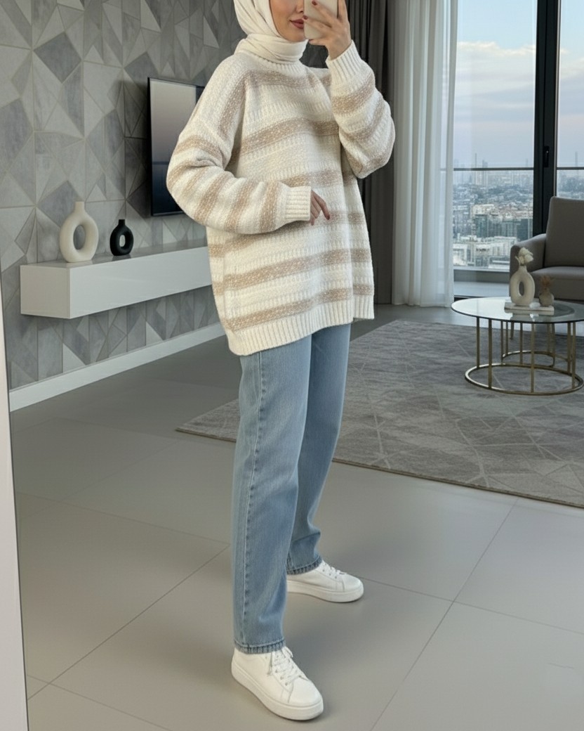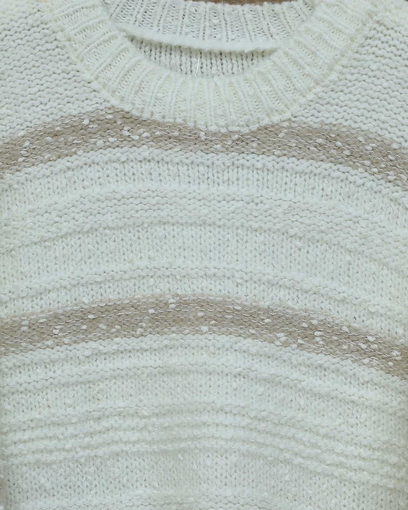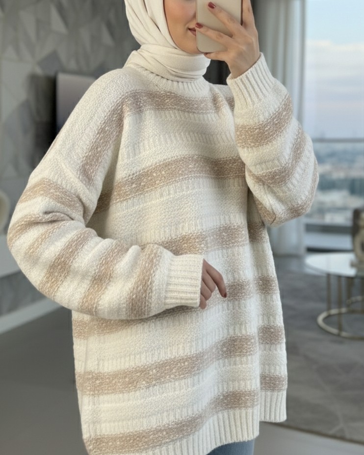 Kalın Çizgi Desenli Örme Triko Kazak -Beyaz-Beyaz