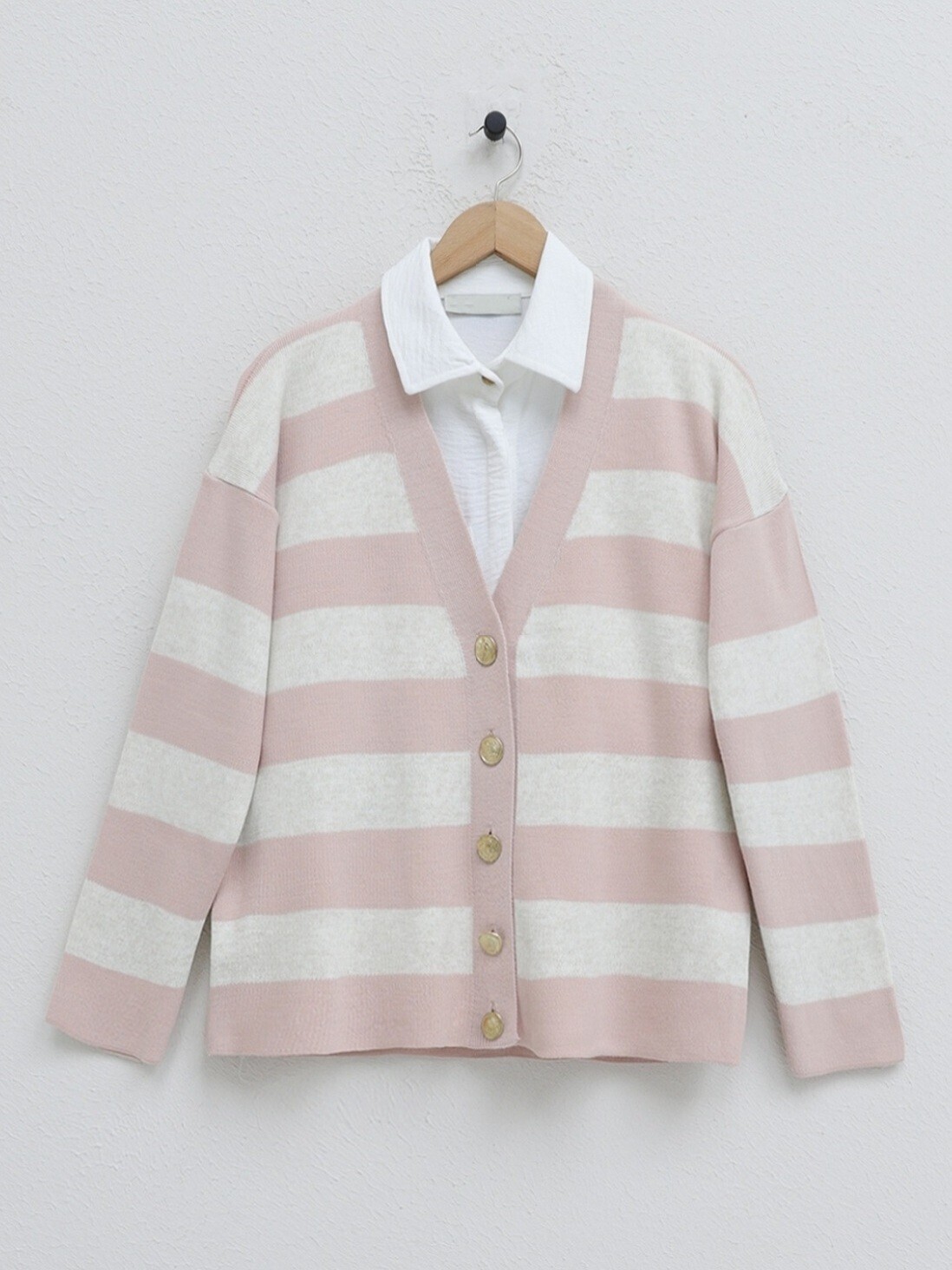 Kalın Çizgili Araboy Triko Hırka -Pembe-Pembe