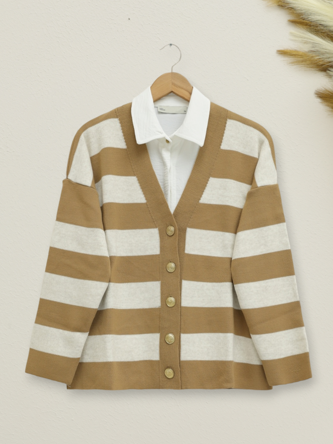 Kalın Çizgili Araboy Triko Hırka -Vizon-Vizon