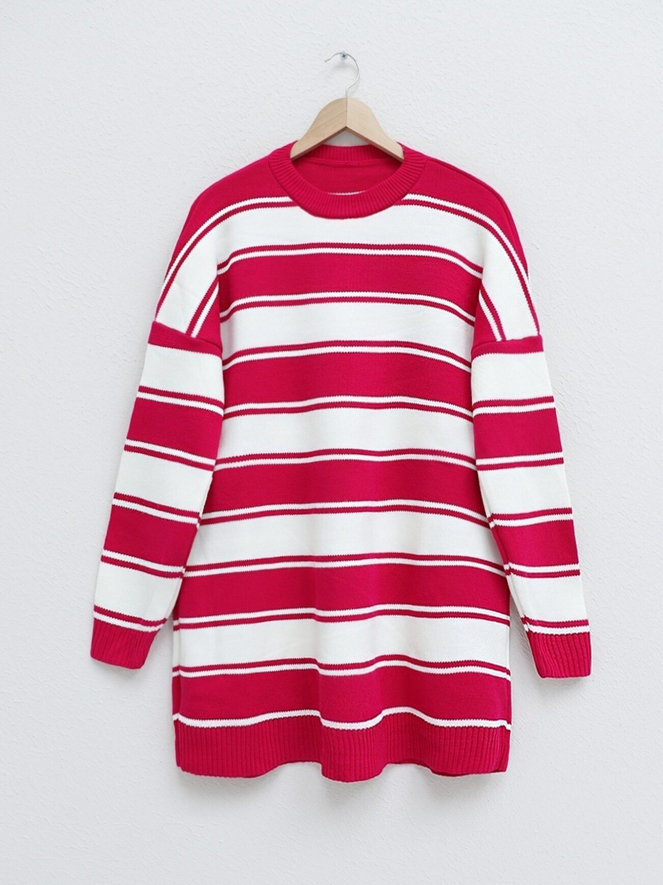 Kalın Çizgili Salaş Triko Tunik -Ekru-Ekru