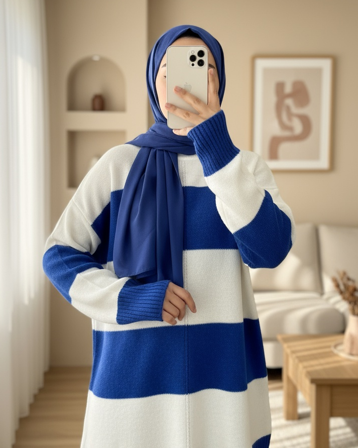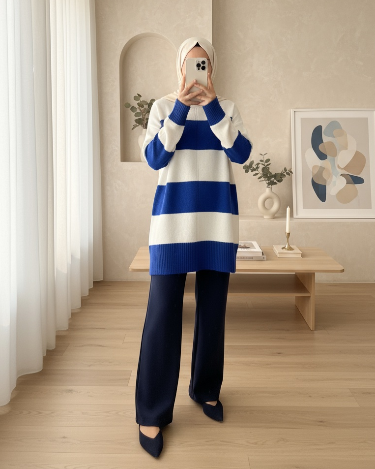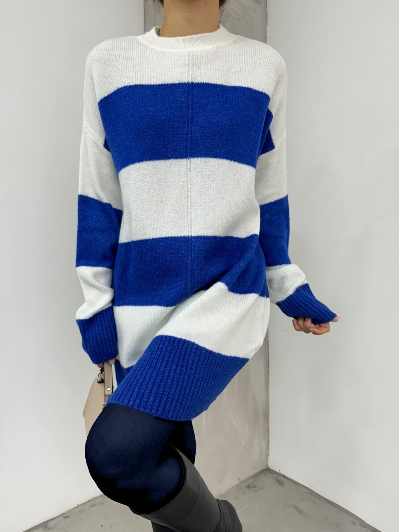 Kalın Çizgili Triko Tunik -Saks-Saks