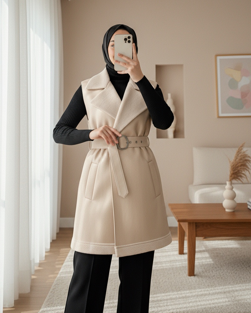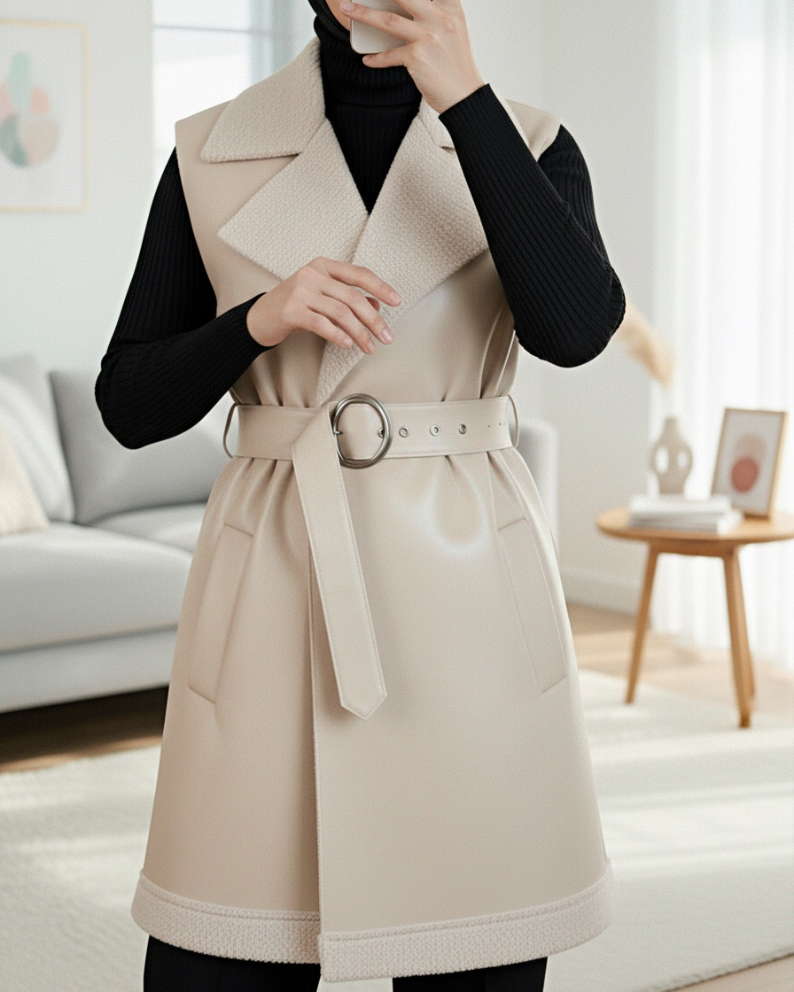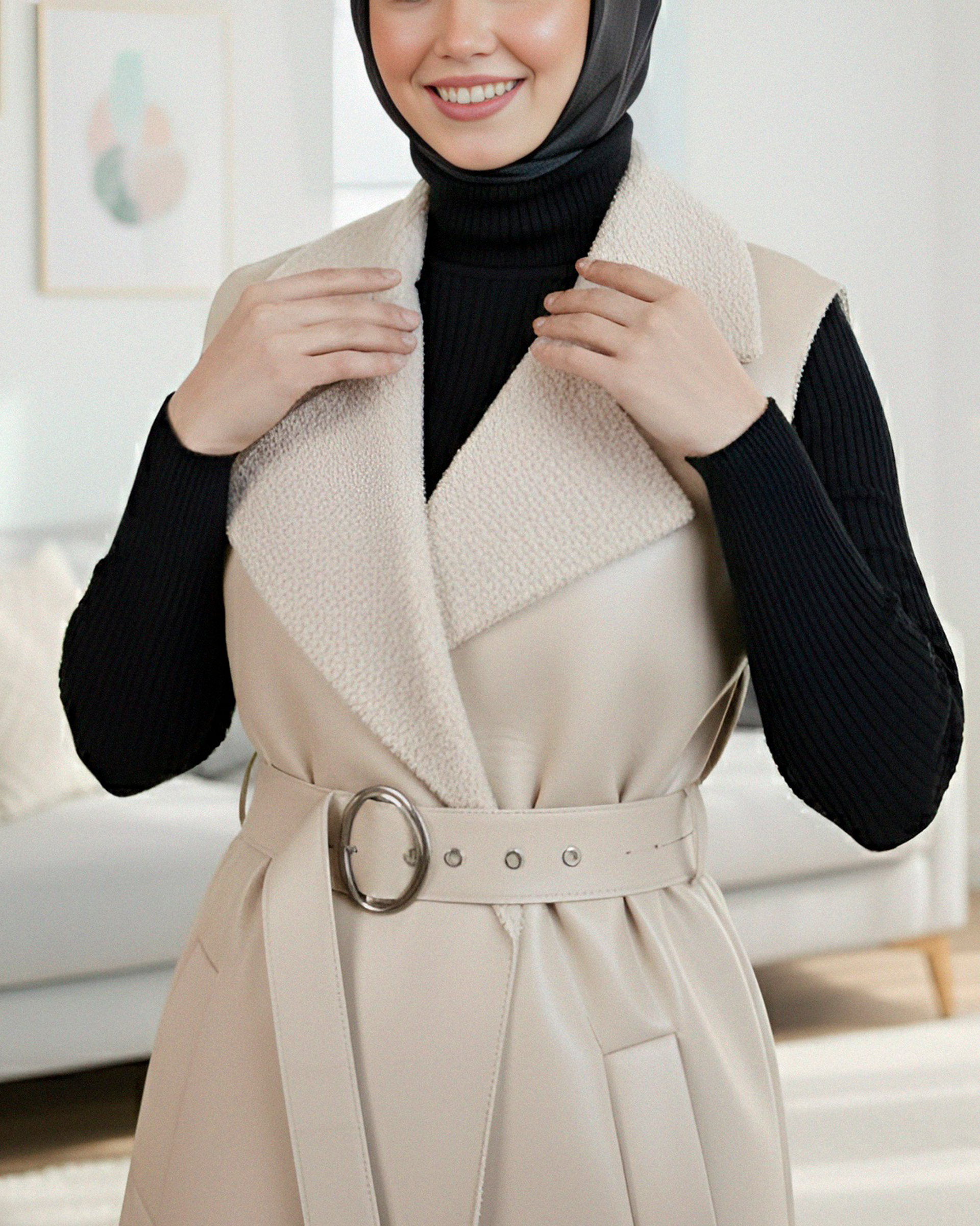 Kalın Kemerli İçi Kürklü Cepli Deri Yelek -Bej-Bej