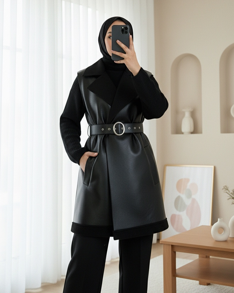 Kalın Kemerli İçi Kürklü Cepli Deri Yelek -Siyah-siyah