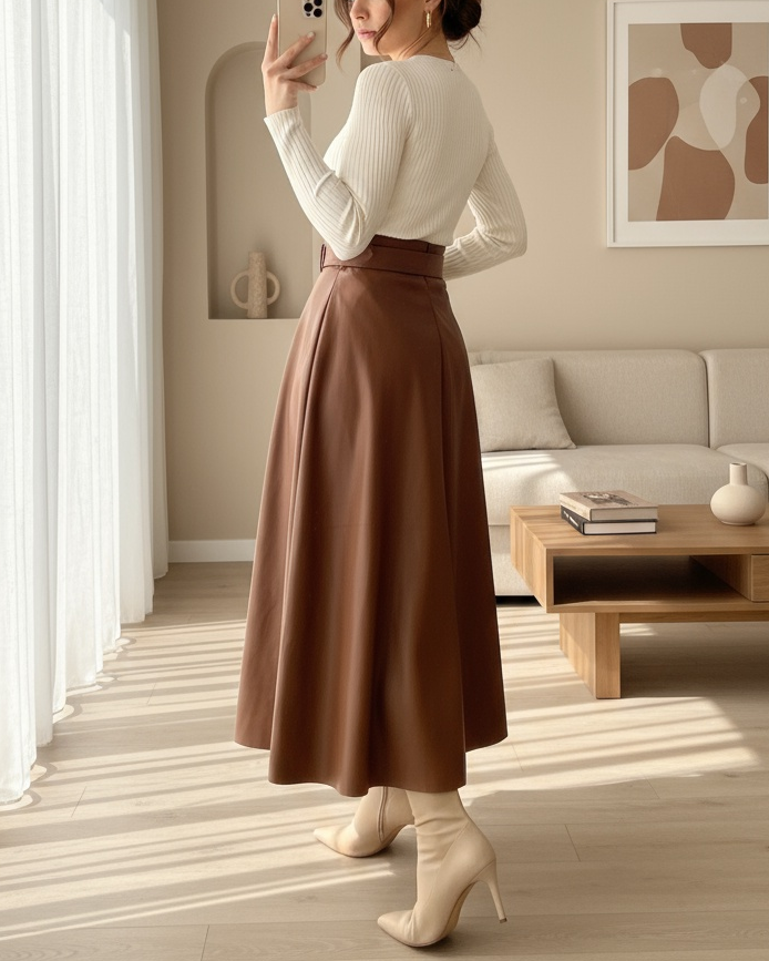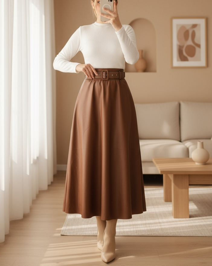 Kalın Kemerli Kloş Deri Etek -Taba-Taba