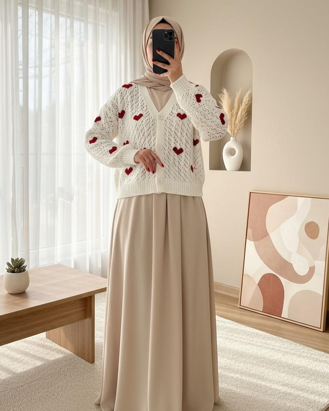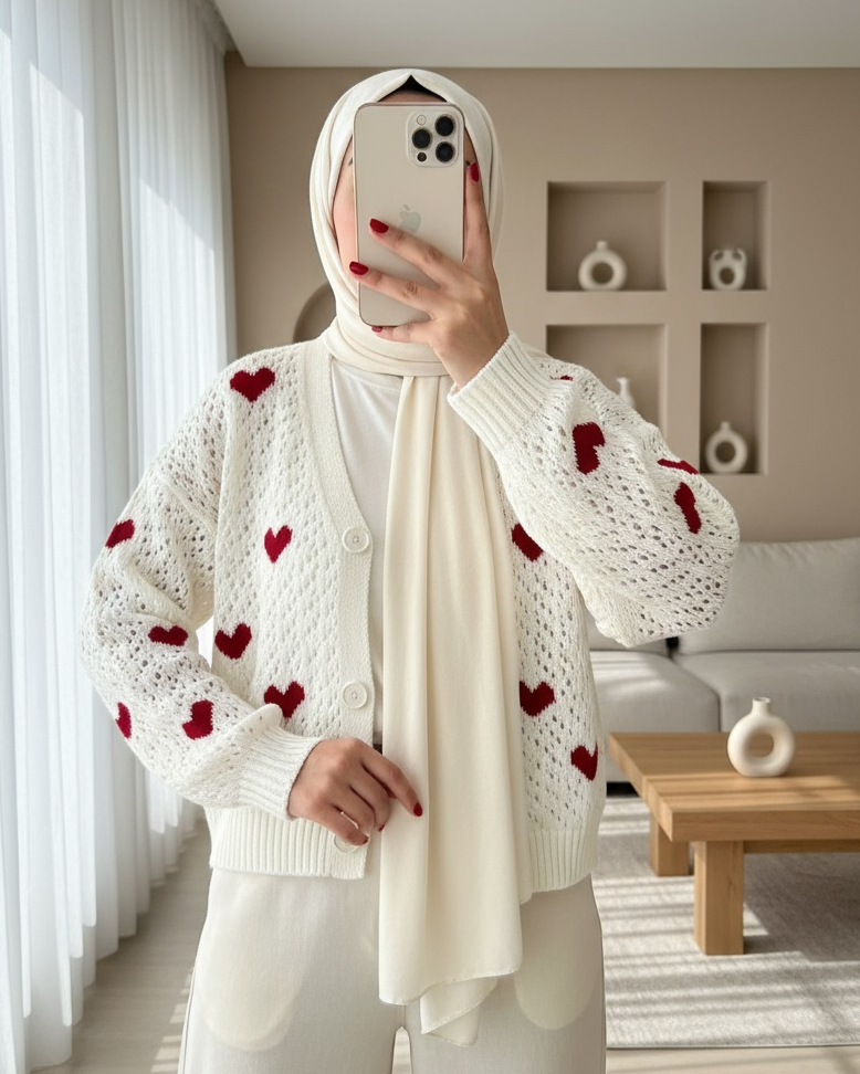 Kalp Desen Düğmeli Ajurlu Triko Hırka -Ekru-Ekru