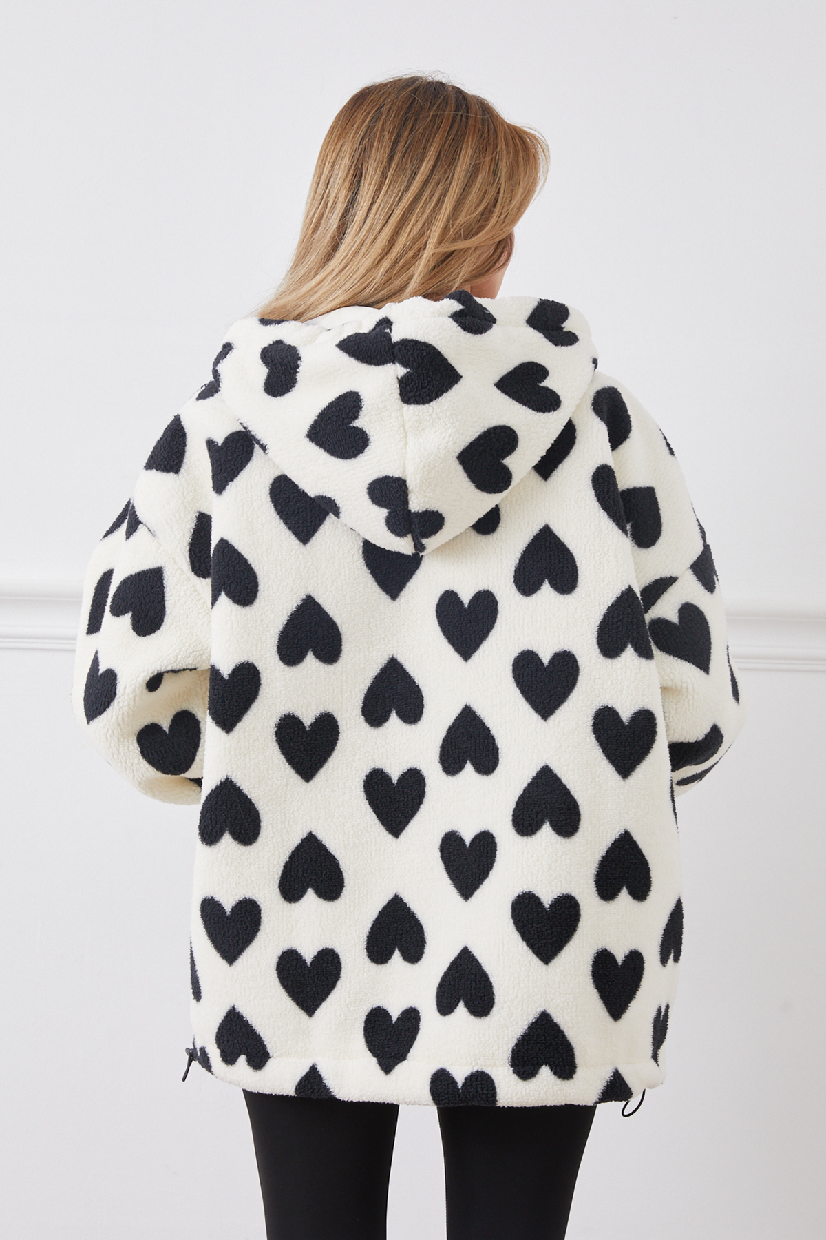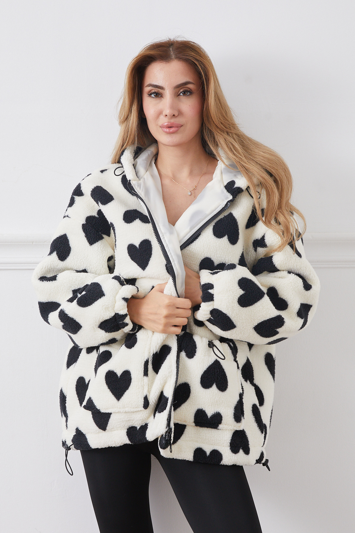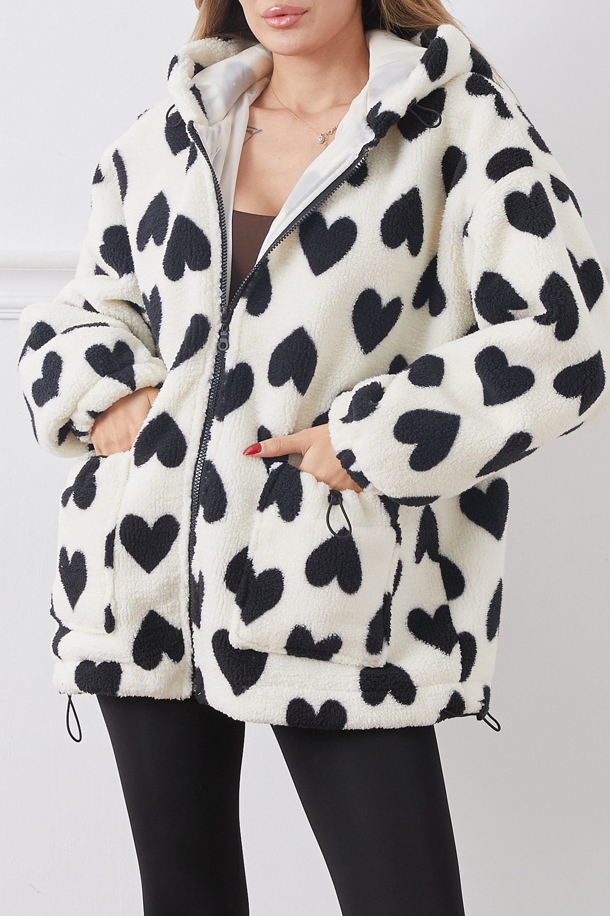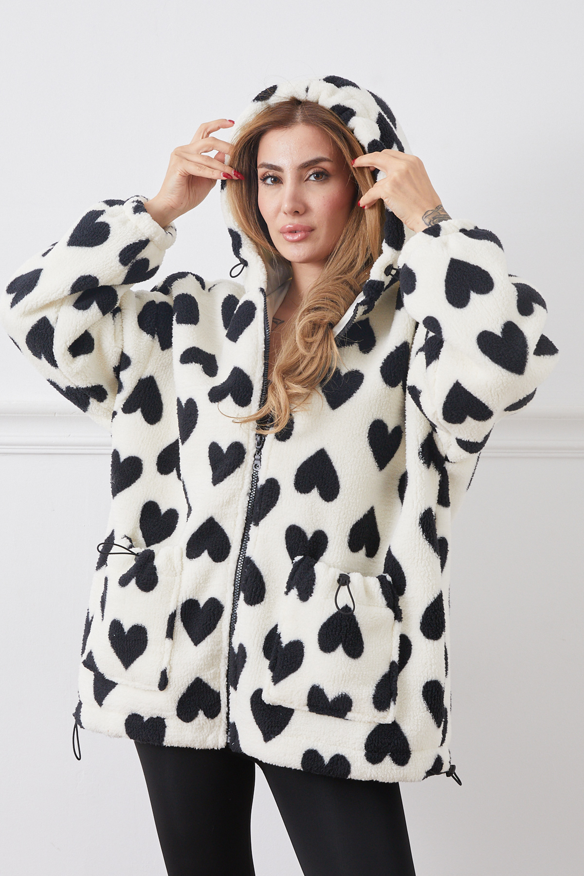 Kalp Desenli Kapüşonlu Peluş Mont-Ekru