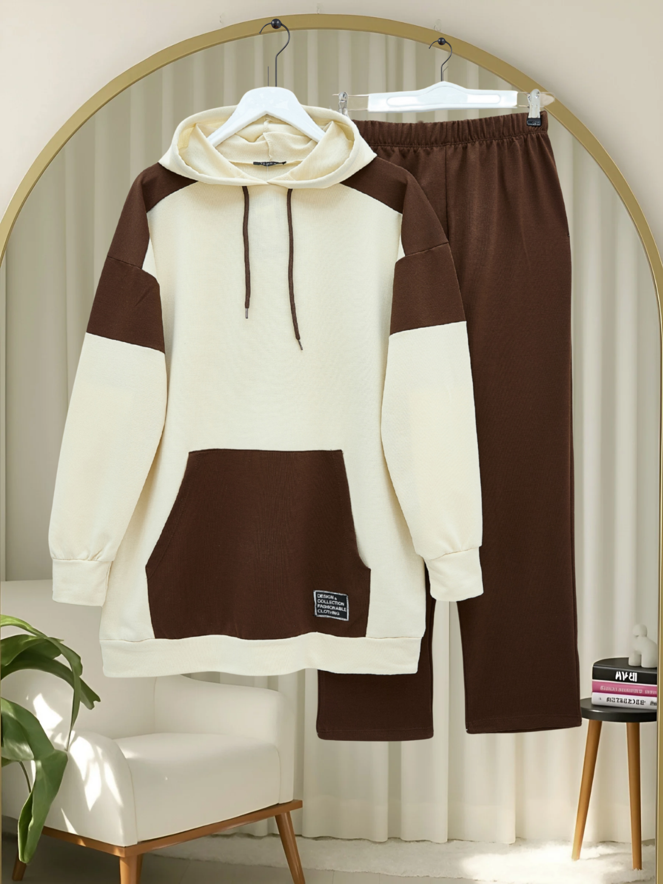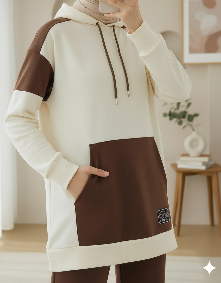 Kanguru Cepli Çift Renkli Takım -Bej-Bej