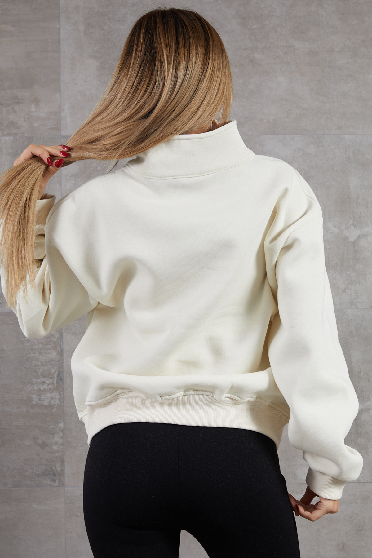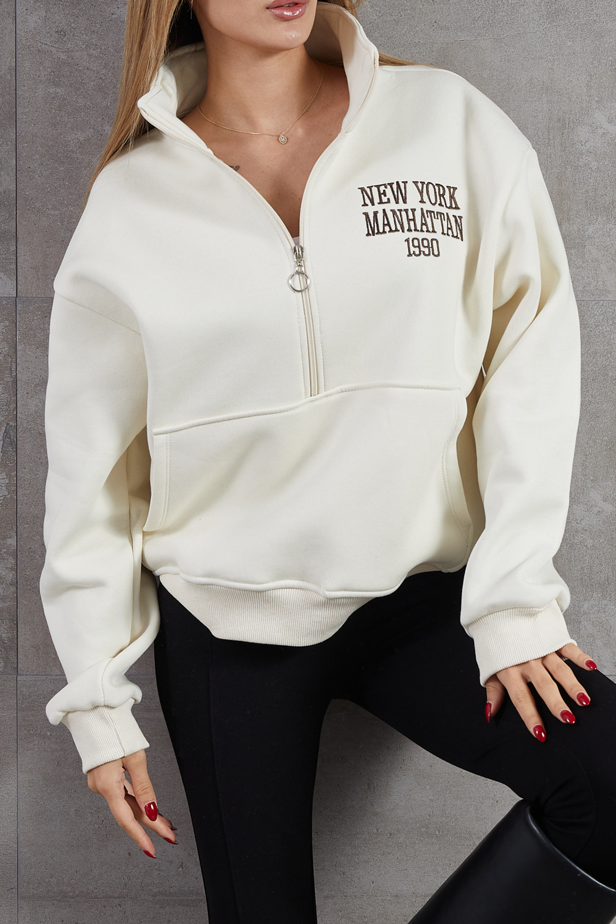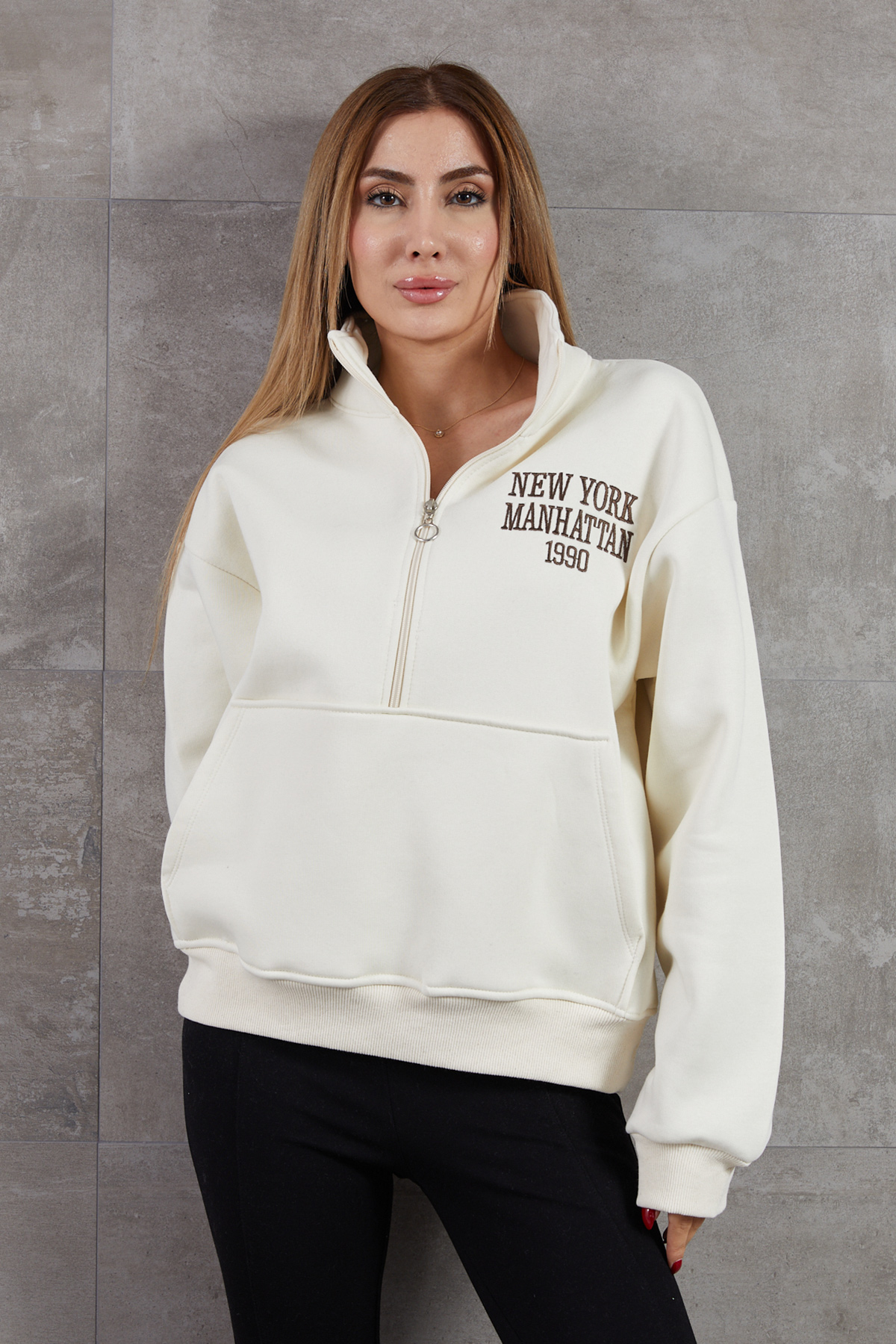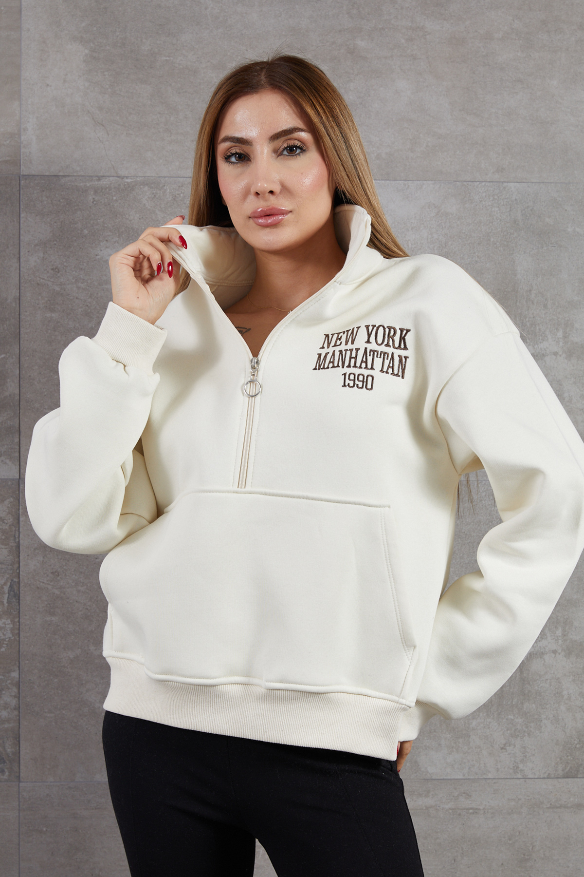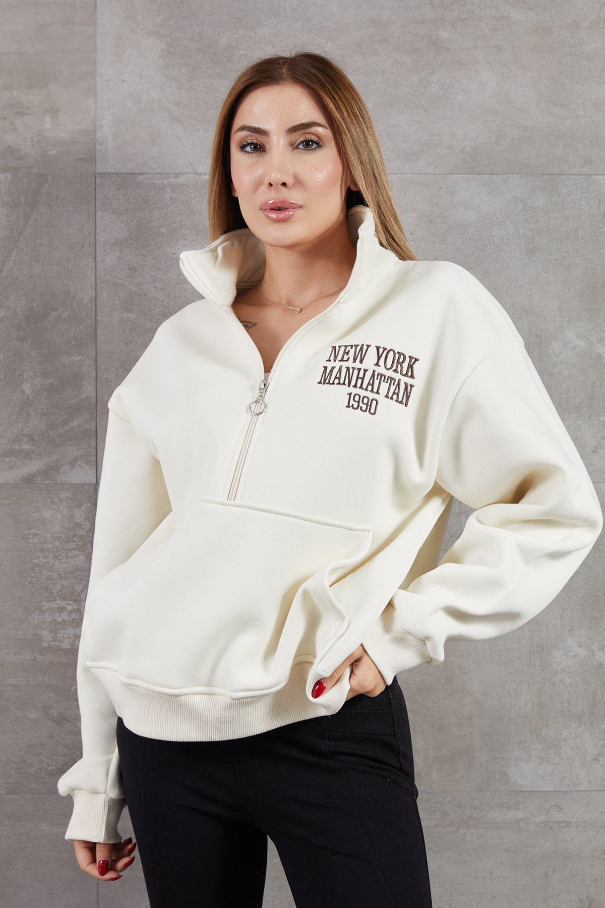 Kanguru Cepli Yarım Fermuarlı Şardonlu Sweatshirt-Bej