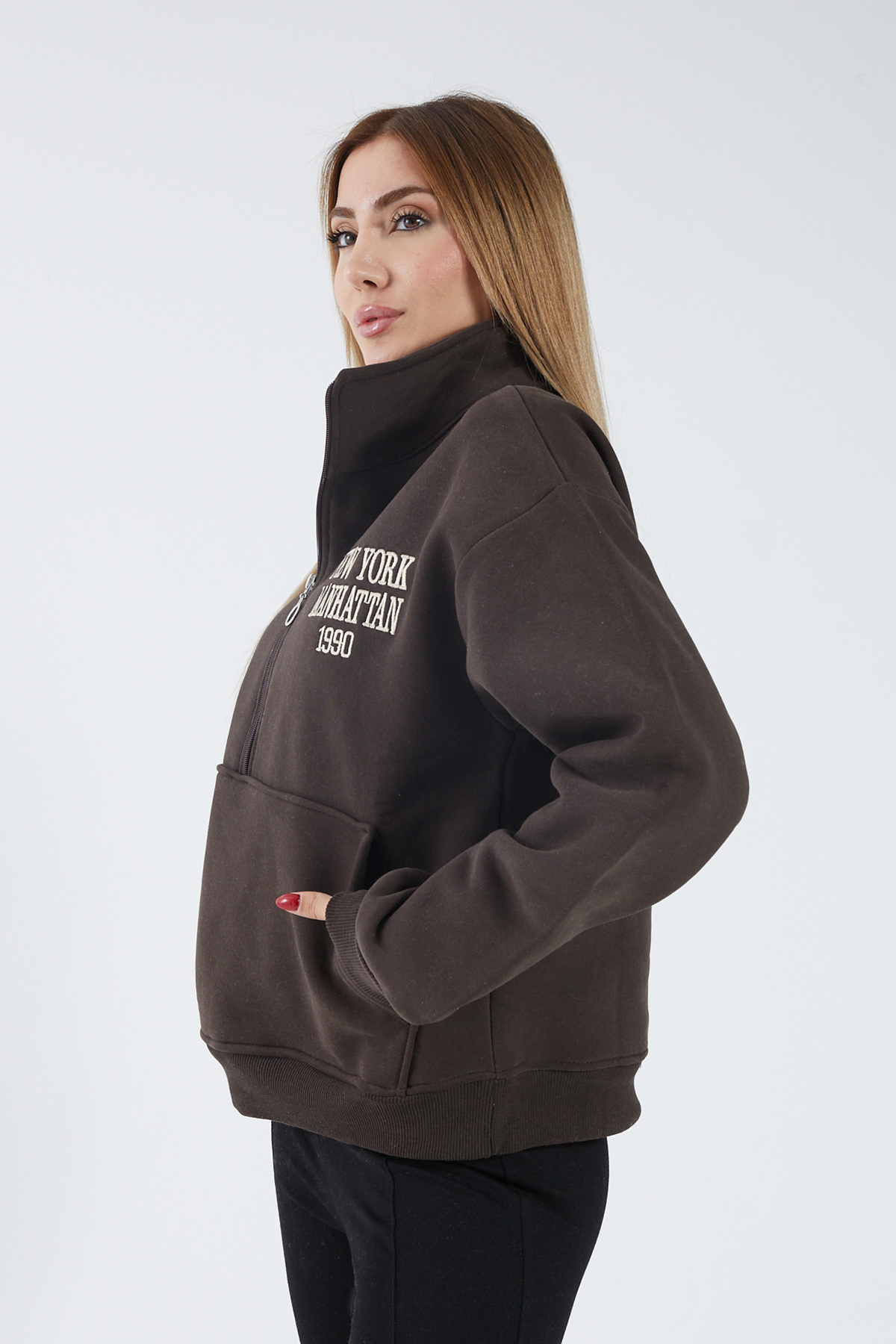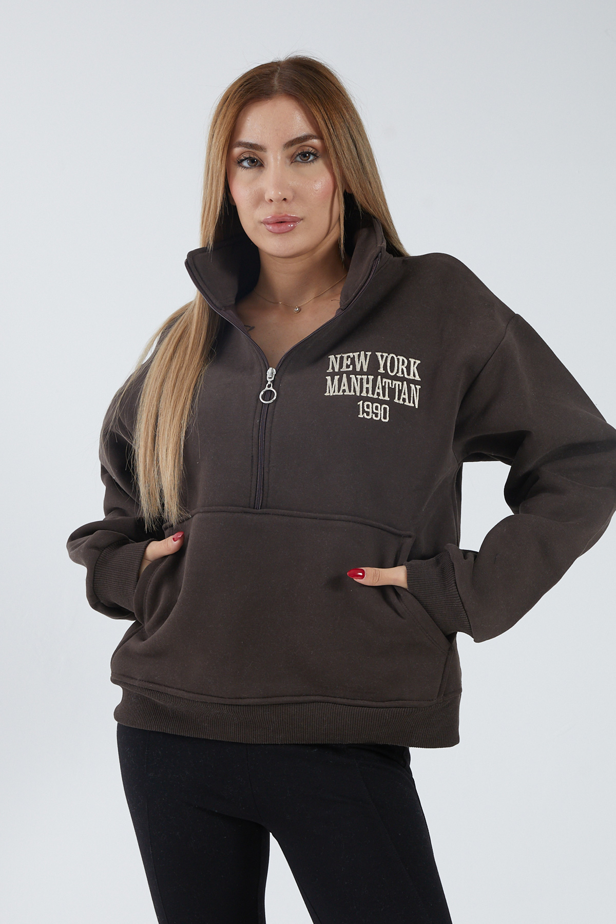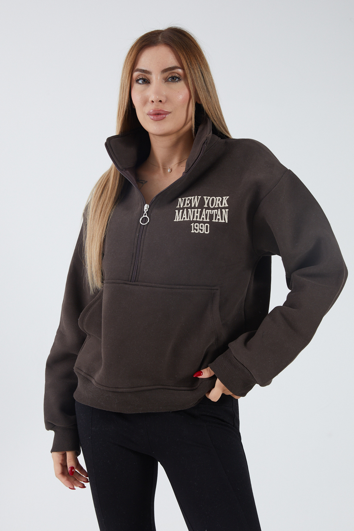 Kanguru Cepli Yarım Fermuarlı Şardonlu Sweatshirt-Kahve