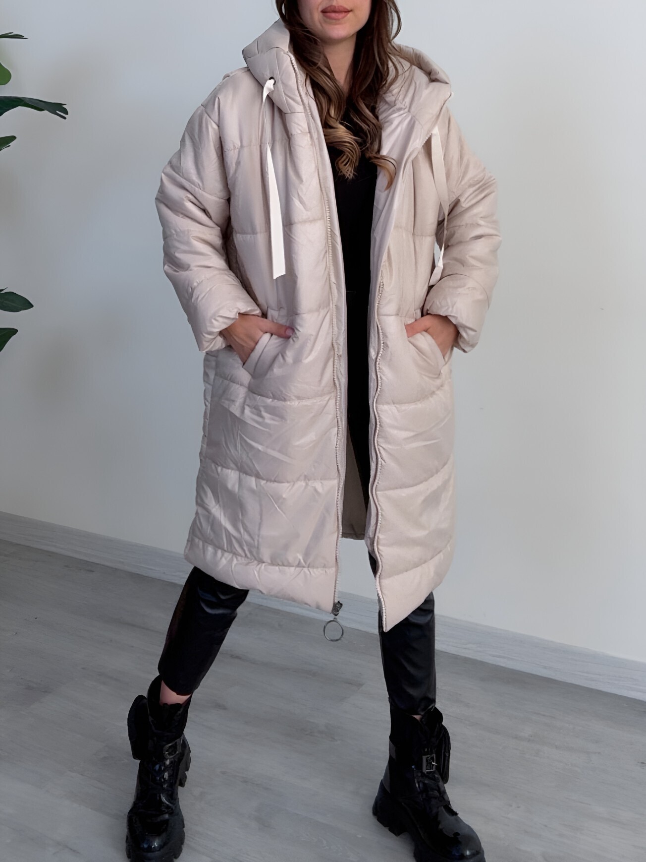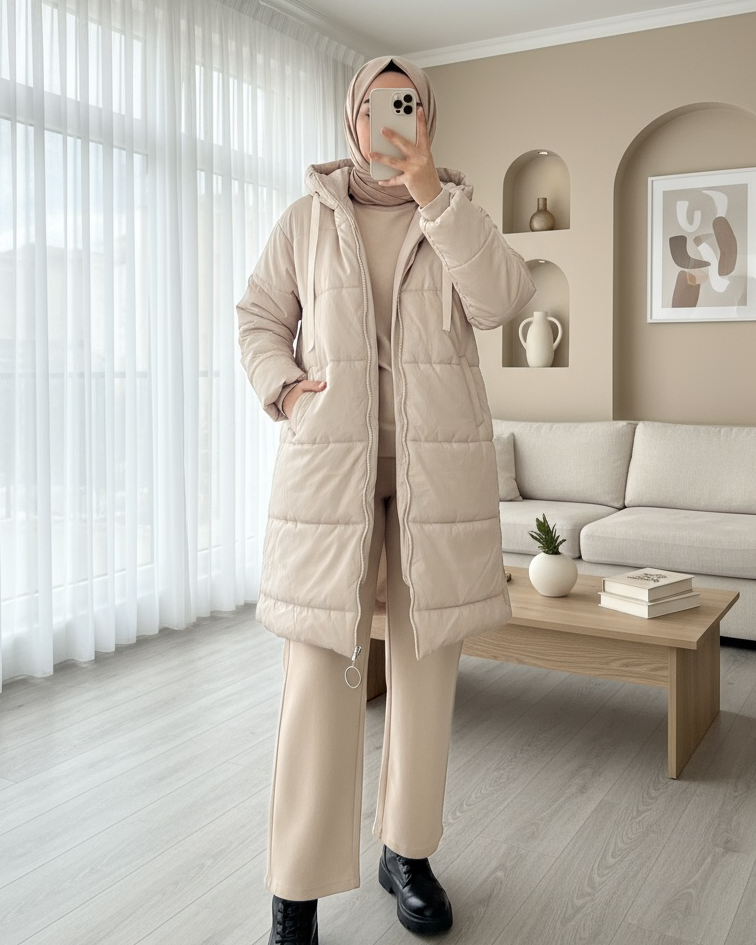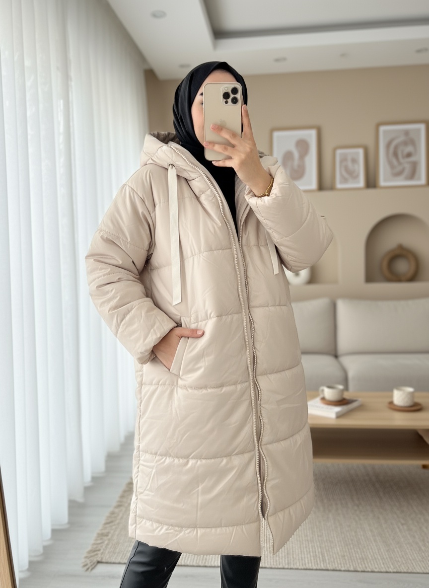 Kapşonlu Bağcık Detaylı Fermuarlı Şişme Mont -Ekru-Ekru