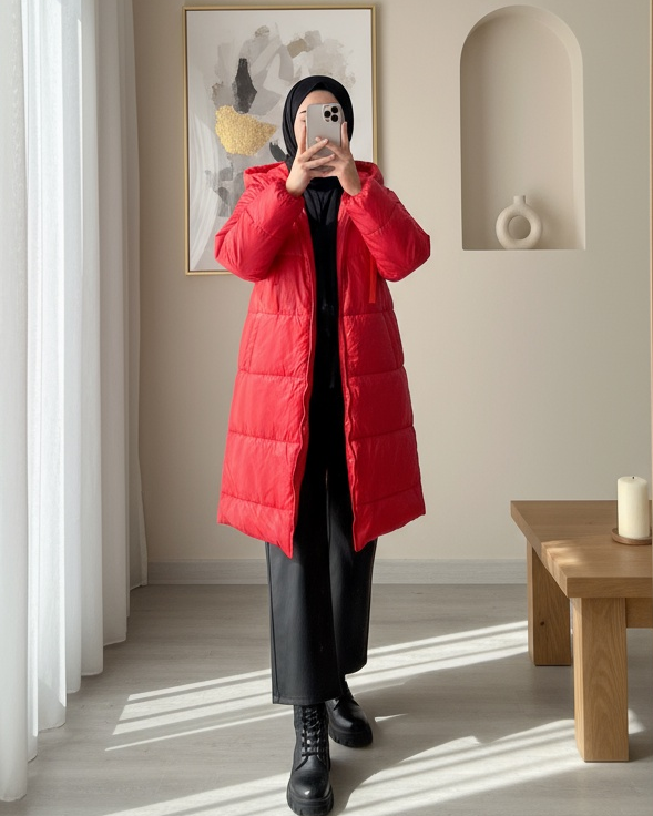 Kapşonlu Bağcık Detaylı Fermuarlı Şişme Mont -Kırmızı-Kırmızı