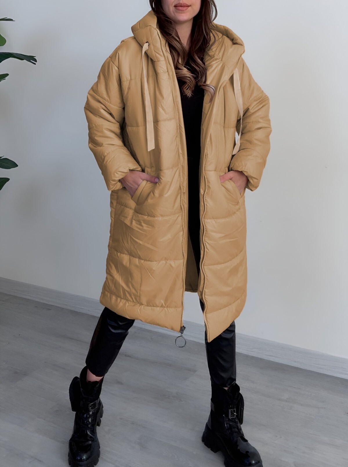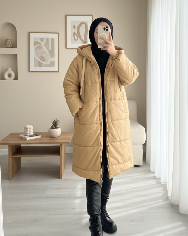 Kapşonlu Bağcık Detaylı Fermuarlı Şişme Mont -Vizon-Vizon