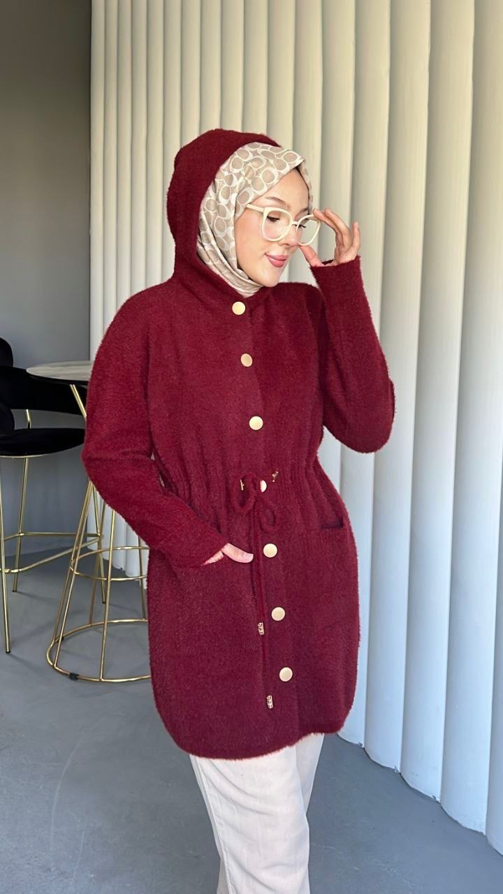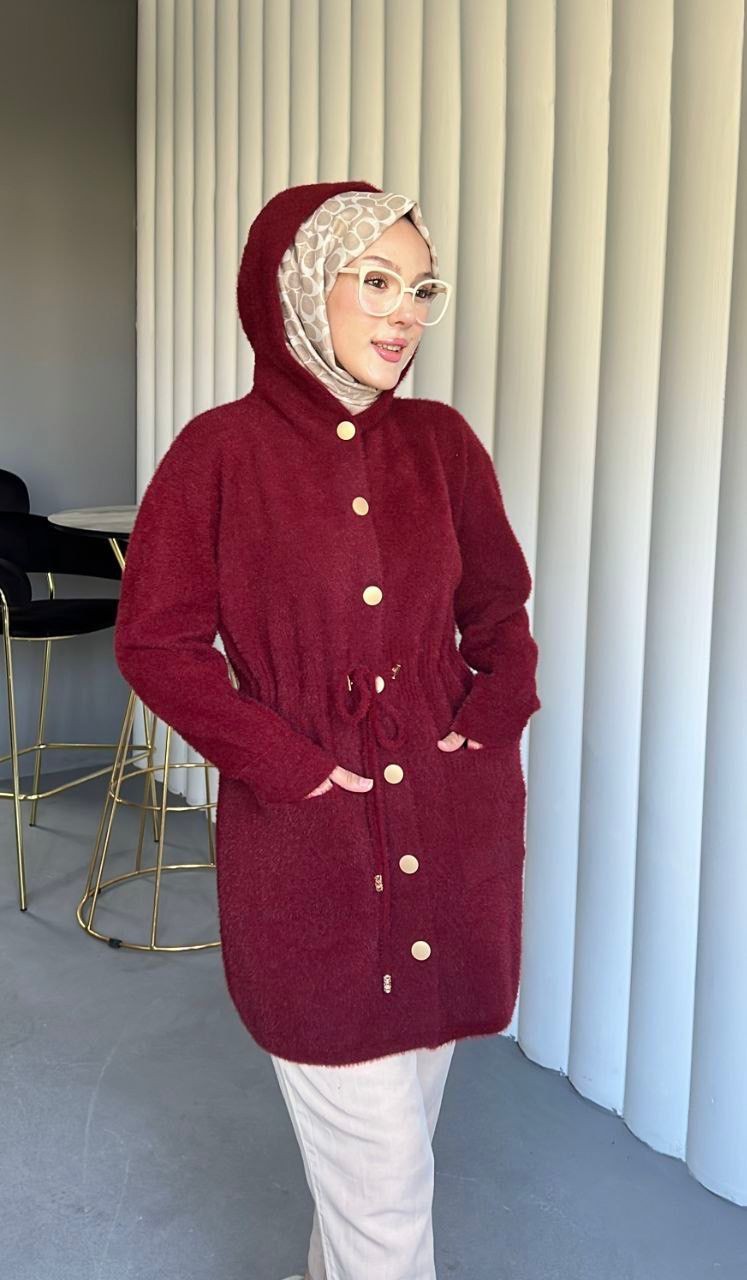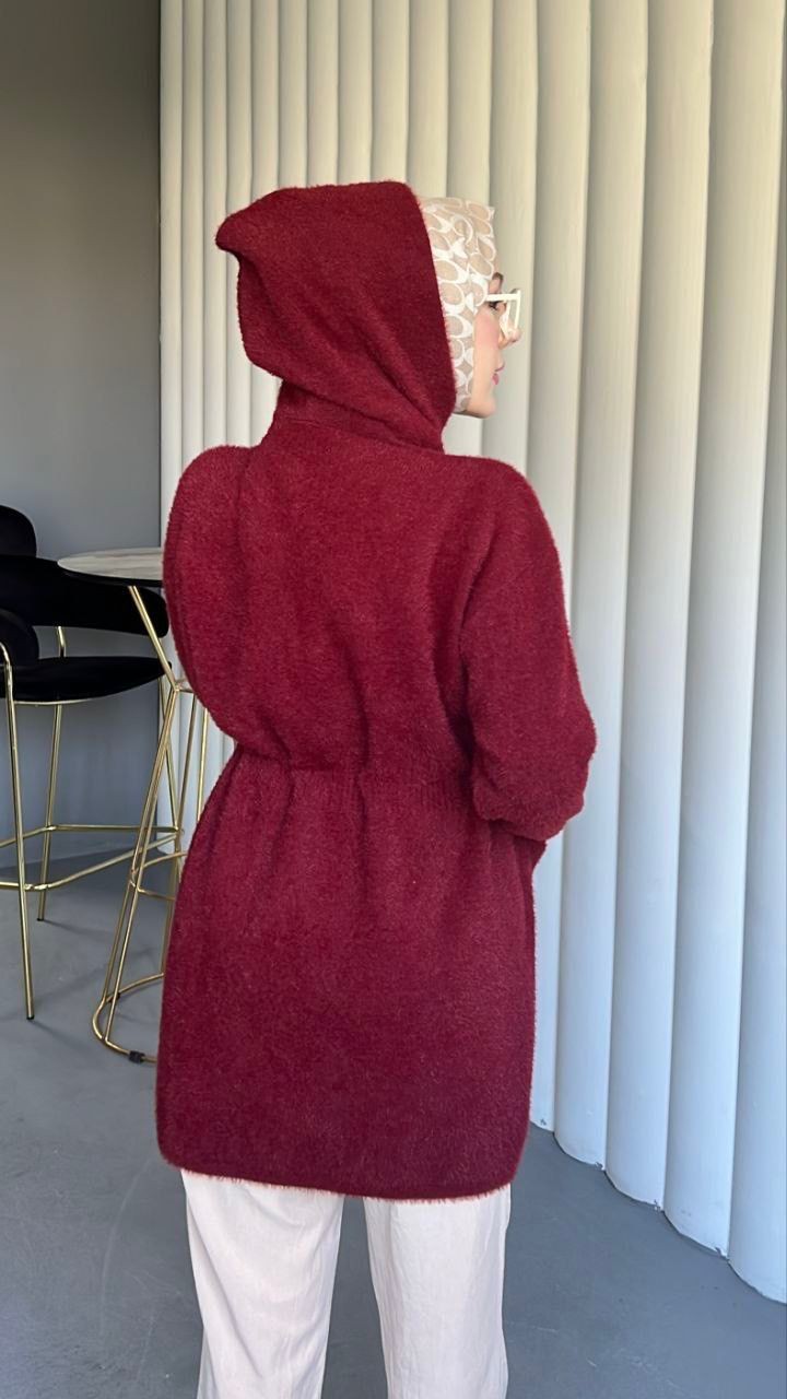 Kapşonlu Beli Bağlamalı Düğmeli Sakallı Kap -Bordo-Bordo