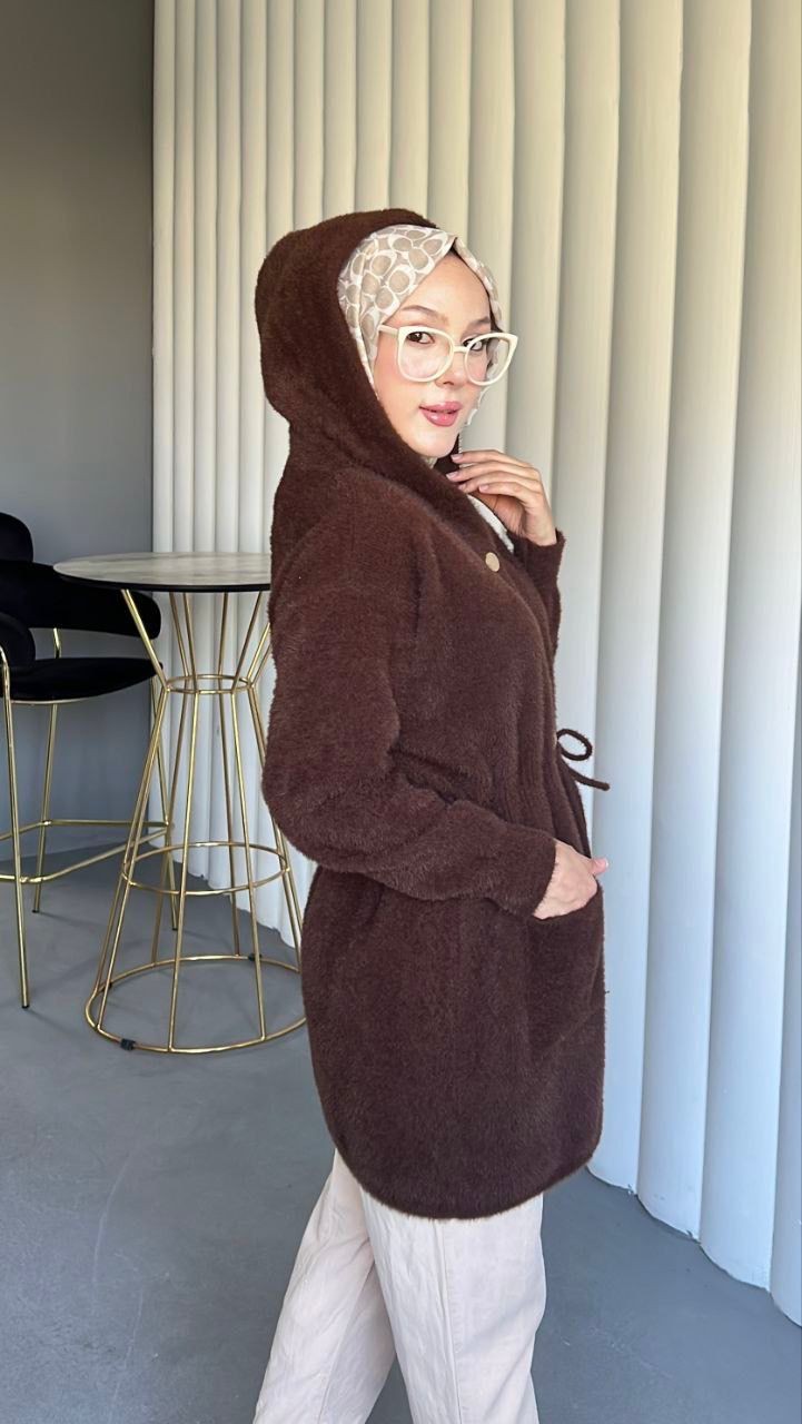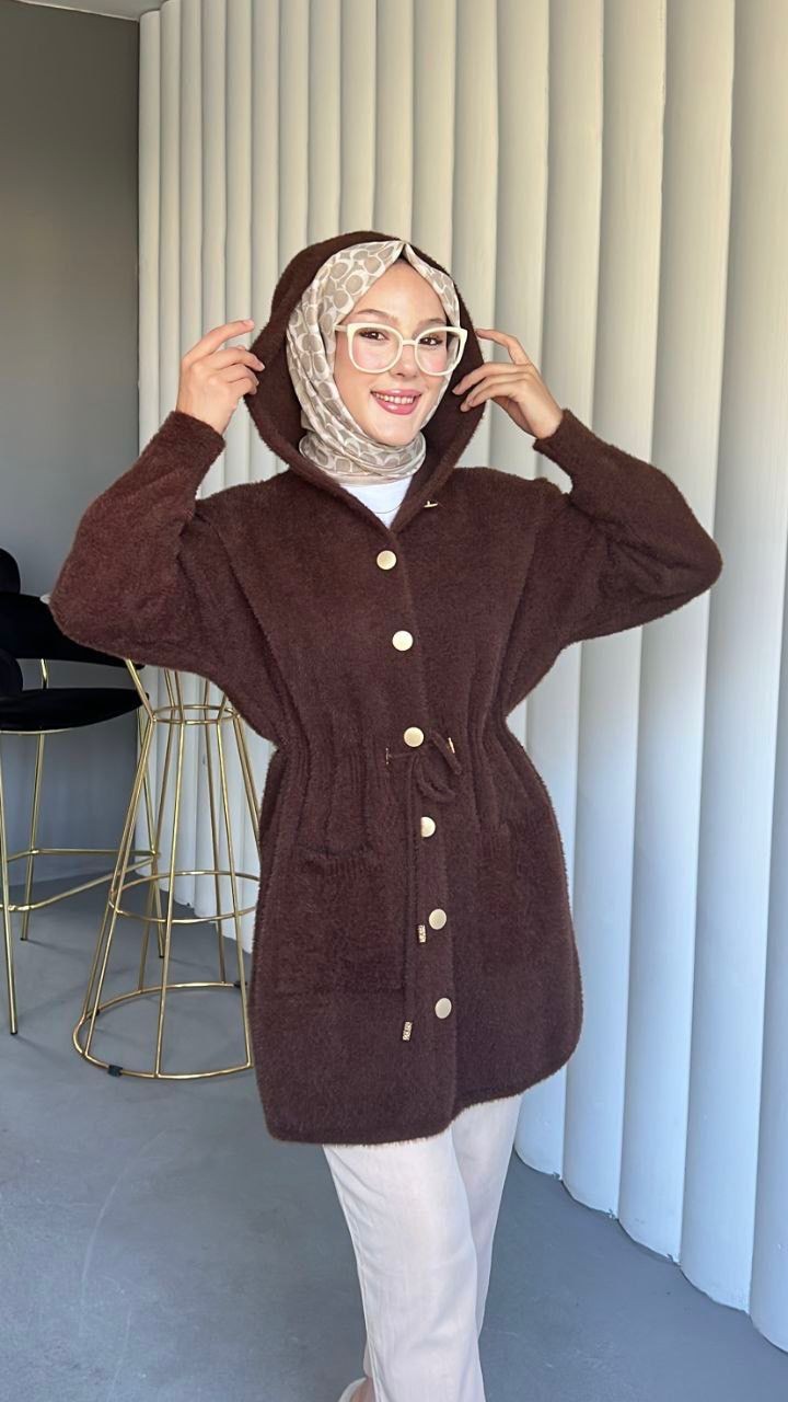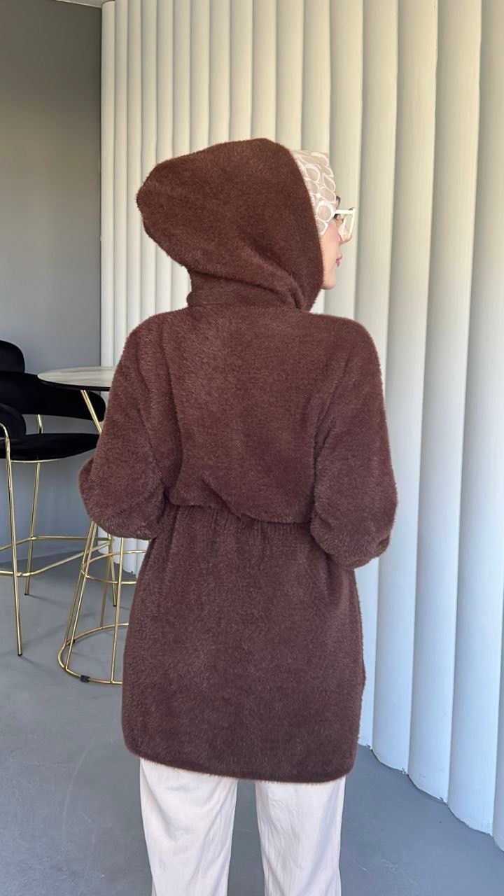 Kapşonlu Beli Bağlamalı Düğmeli Sakallı Kap -Kahve-Kahve