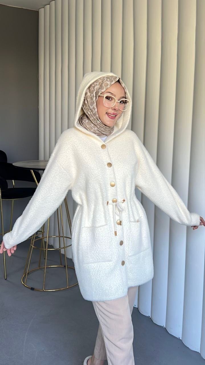 Kapşonlu Beli Bağlamalı Düğmeli Sakallı Kap -Krem-Krem
