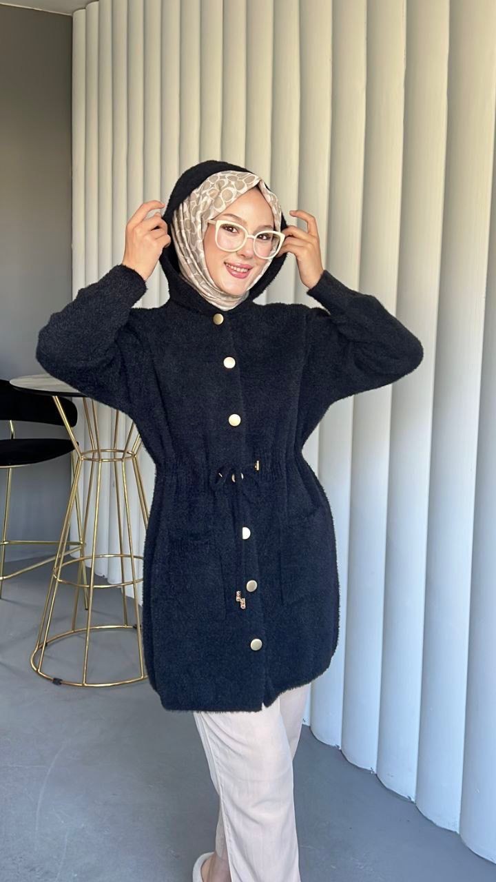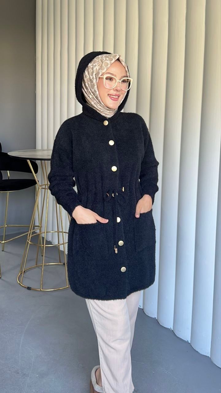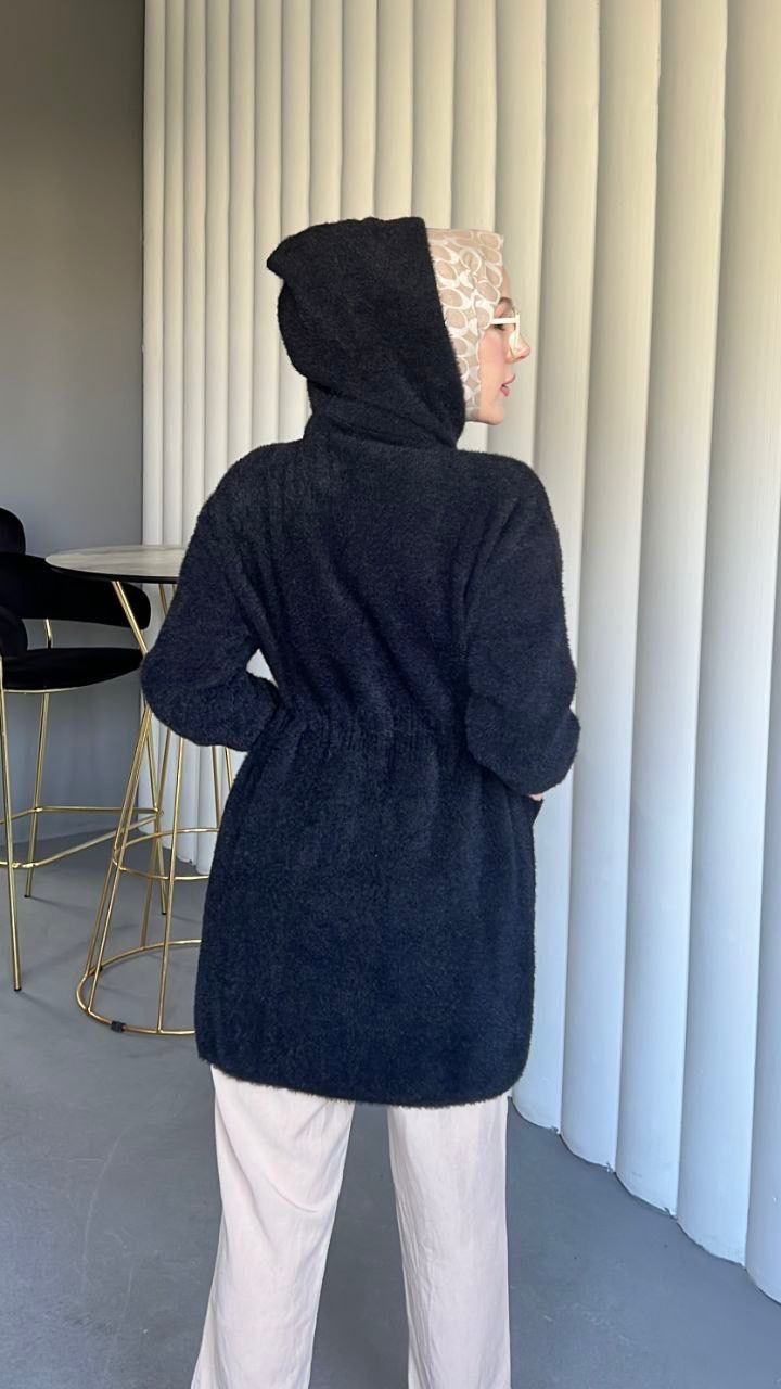 Kapşonlu Beli Bağlamalı Düğmeli Sakallı Kap -Siyah-siyah