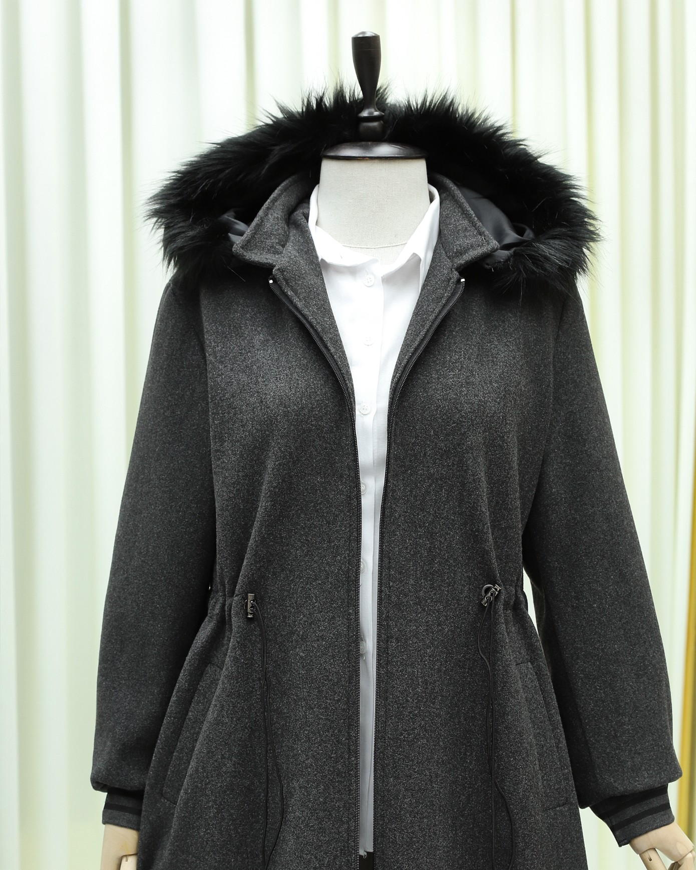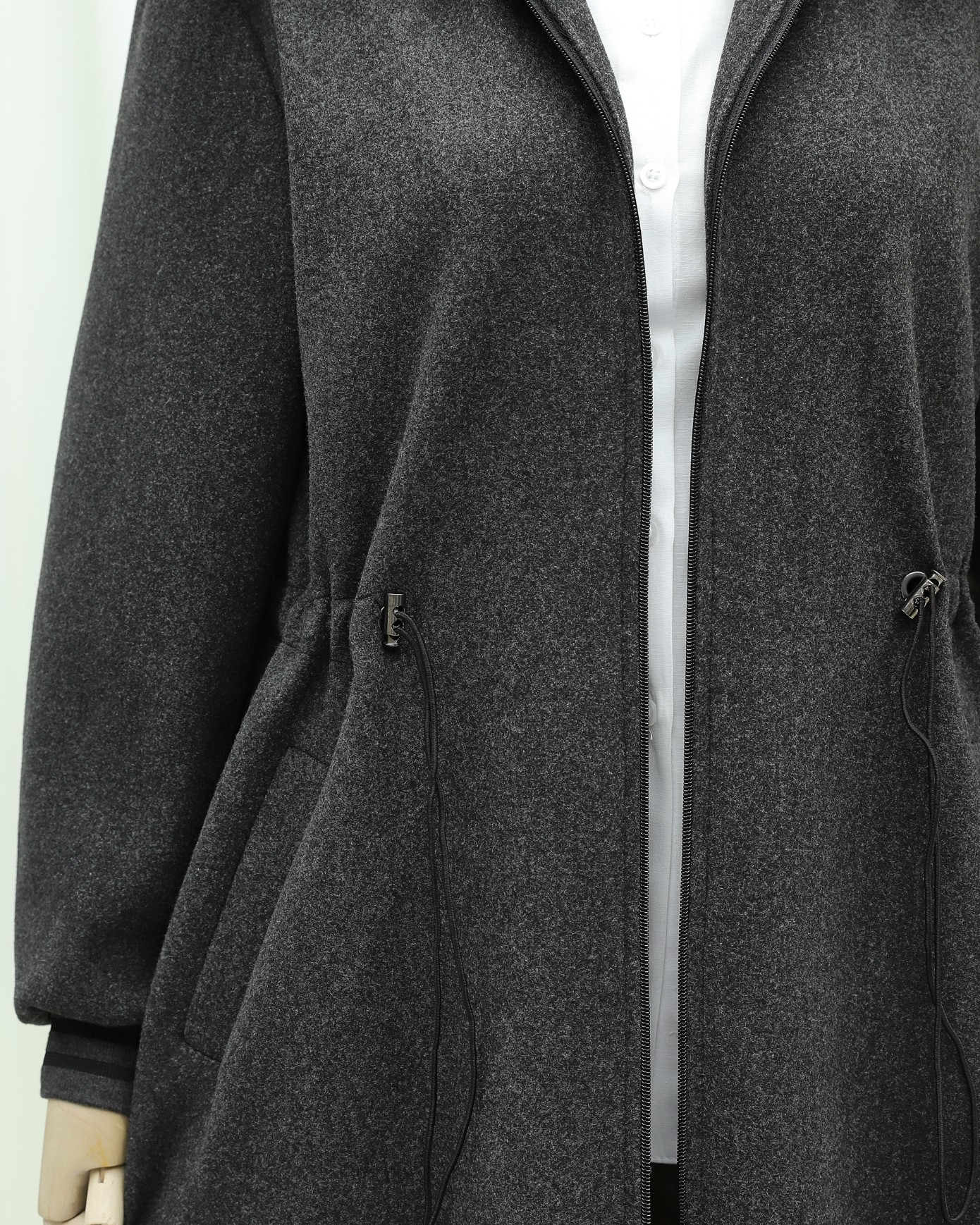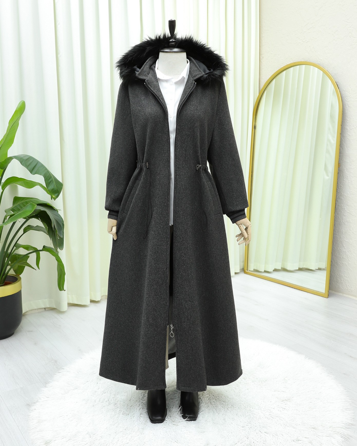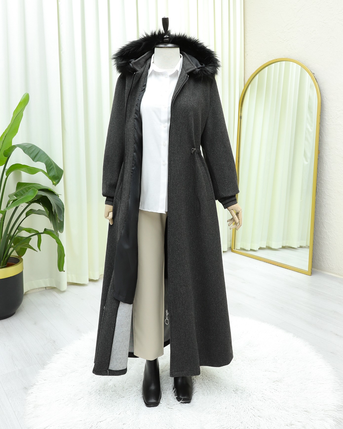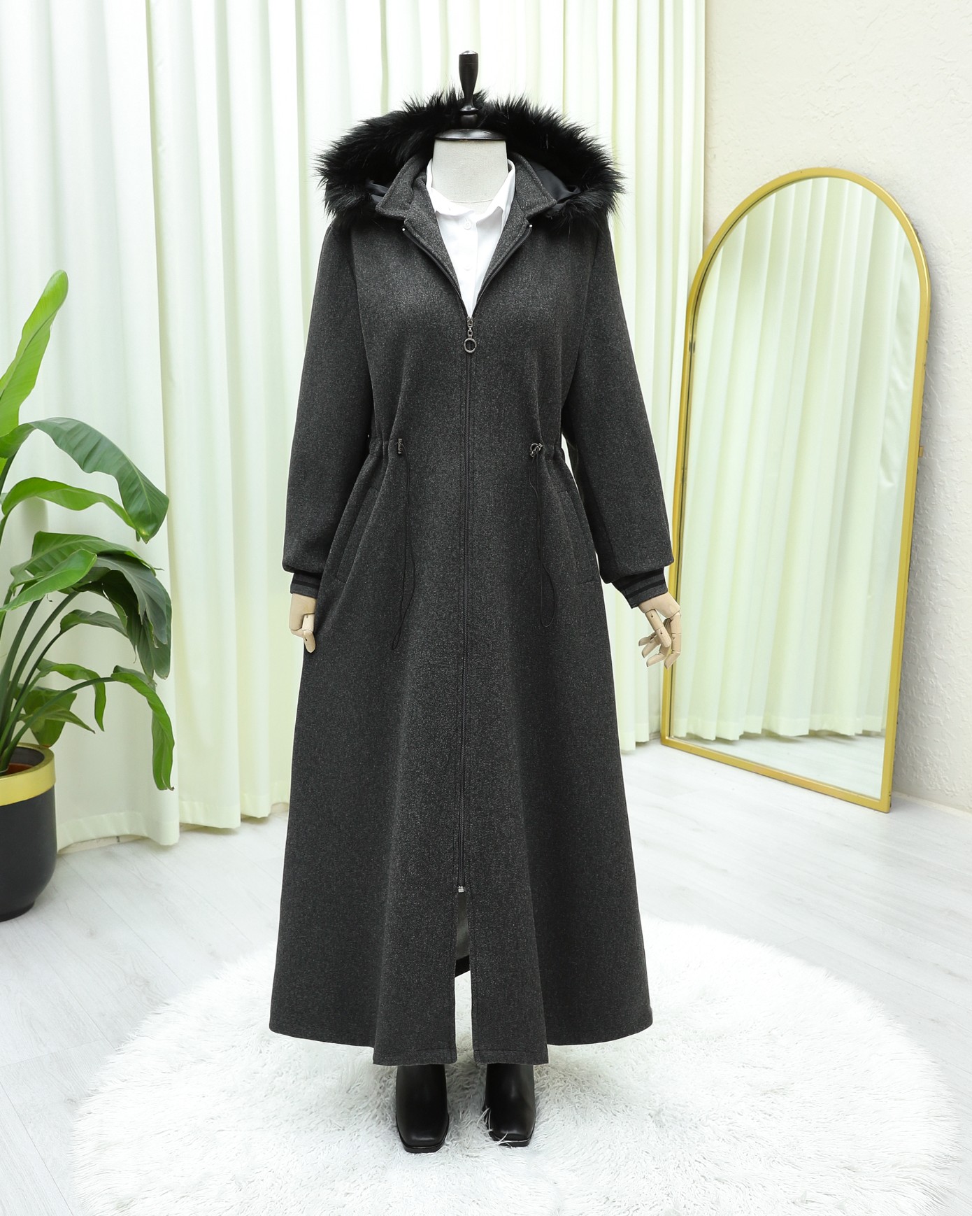 Kapşonlu Beli Lastikli Cepli Kaşe Kaban -Antrasit-Antrasit
